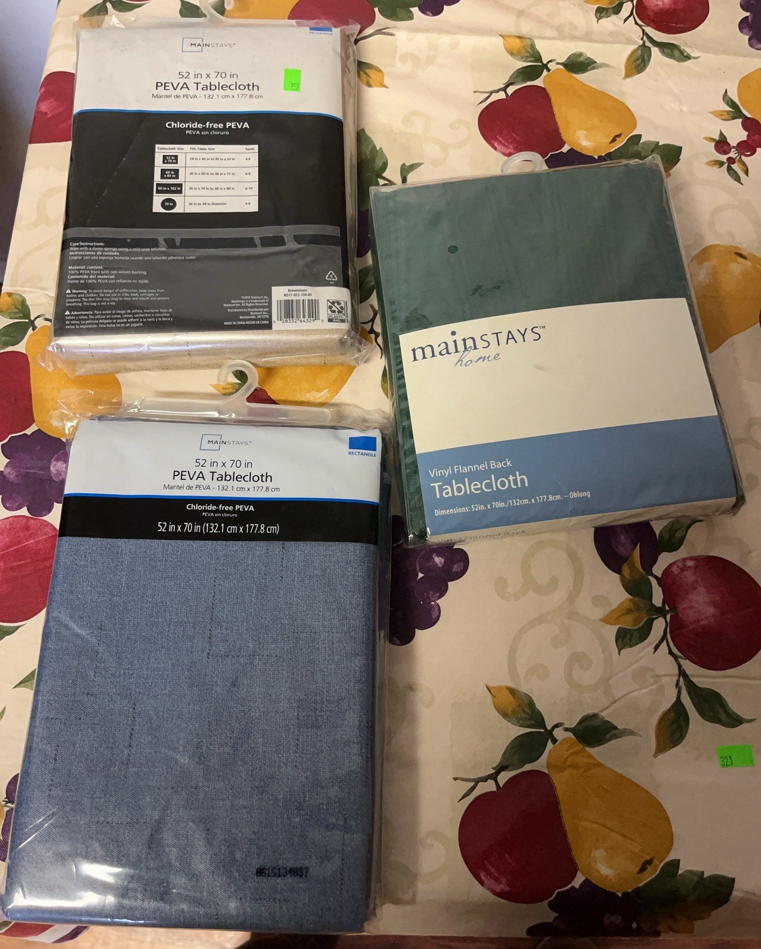 435 3 - Mainstays Tablecloths, White, Blue and Green, In Original Packaging, 52" x 70"