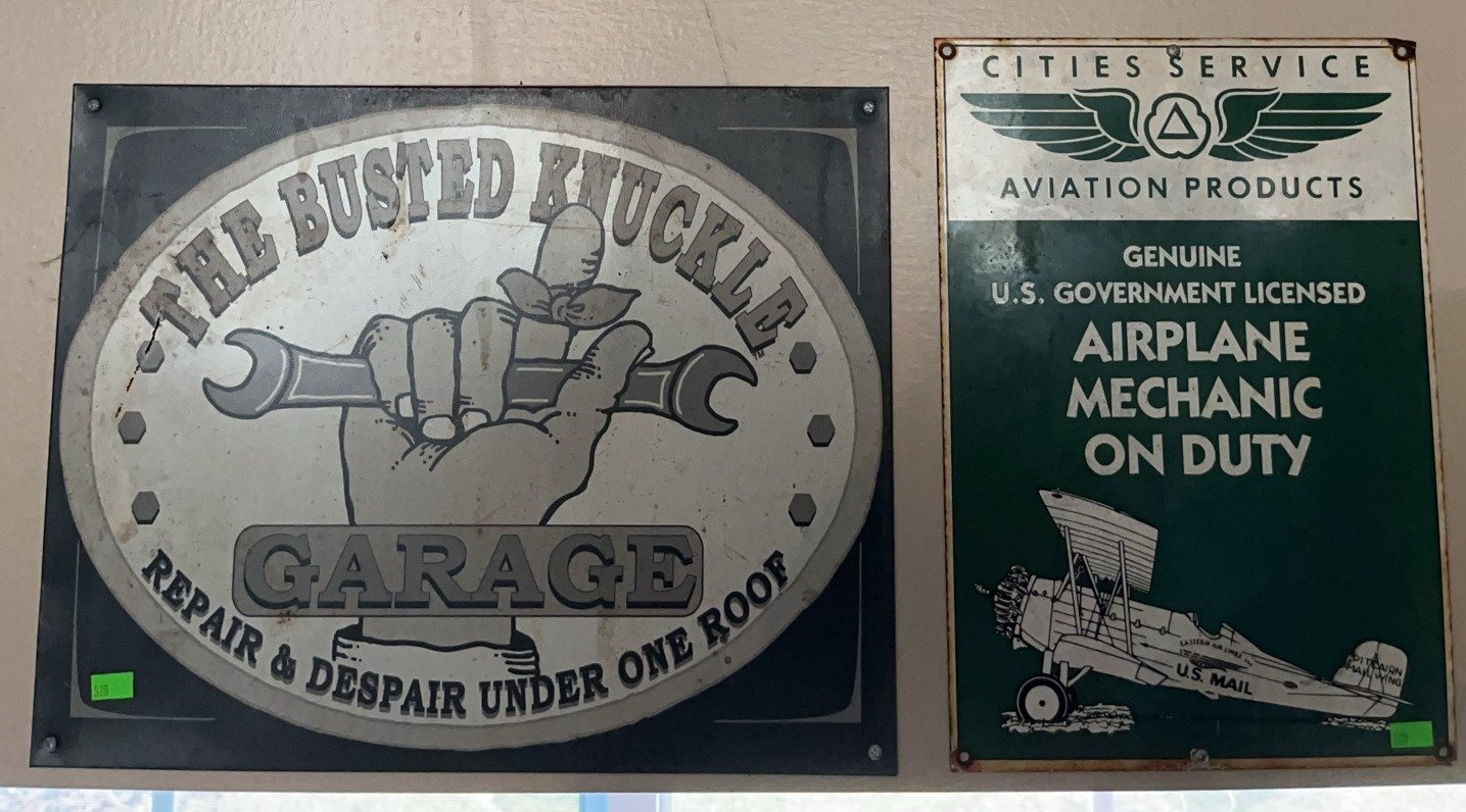 528 2 - Metal Signs: 'Cities Service Aviation Products', 'The Busted Knuckle Garage'