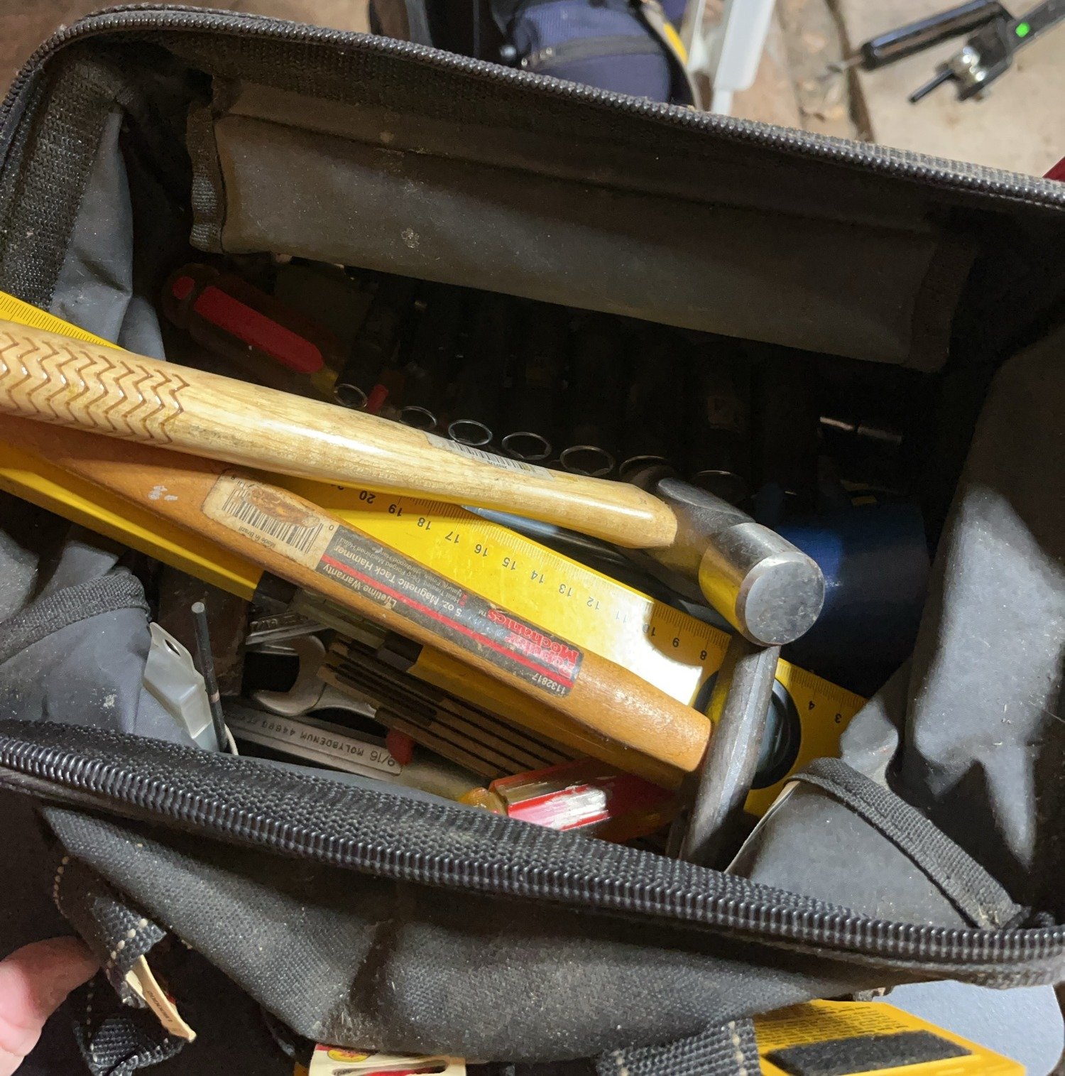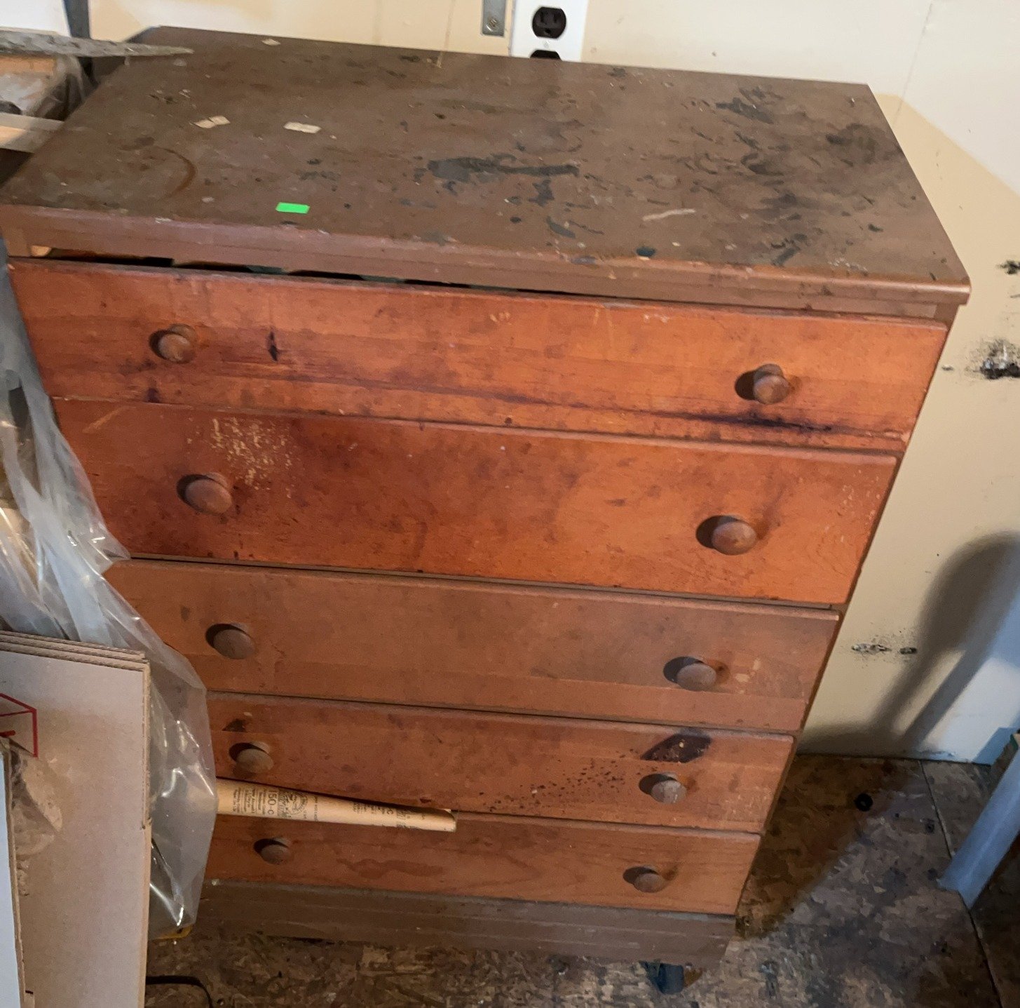 537 Wood 5 Drawer Dresser Chest Containing Hardware and Power Tools 26x43x15