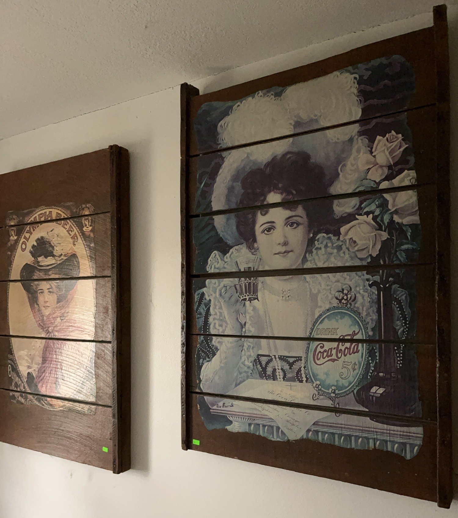 544 2 - Wood advertisement signs: Olympia Beer and Drink Coca-cola 24”x 36”
