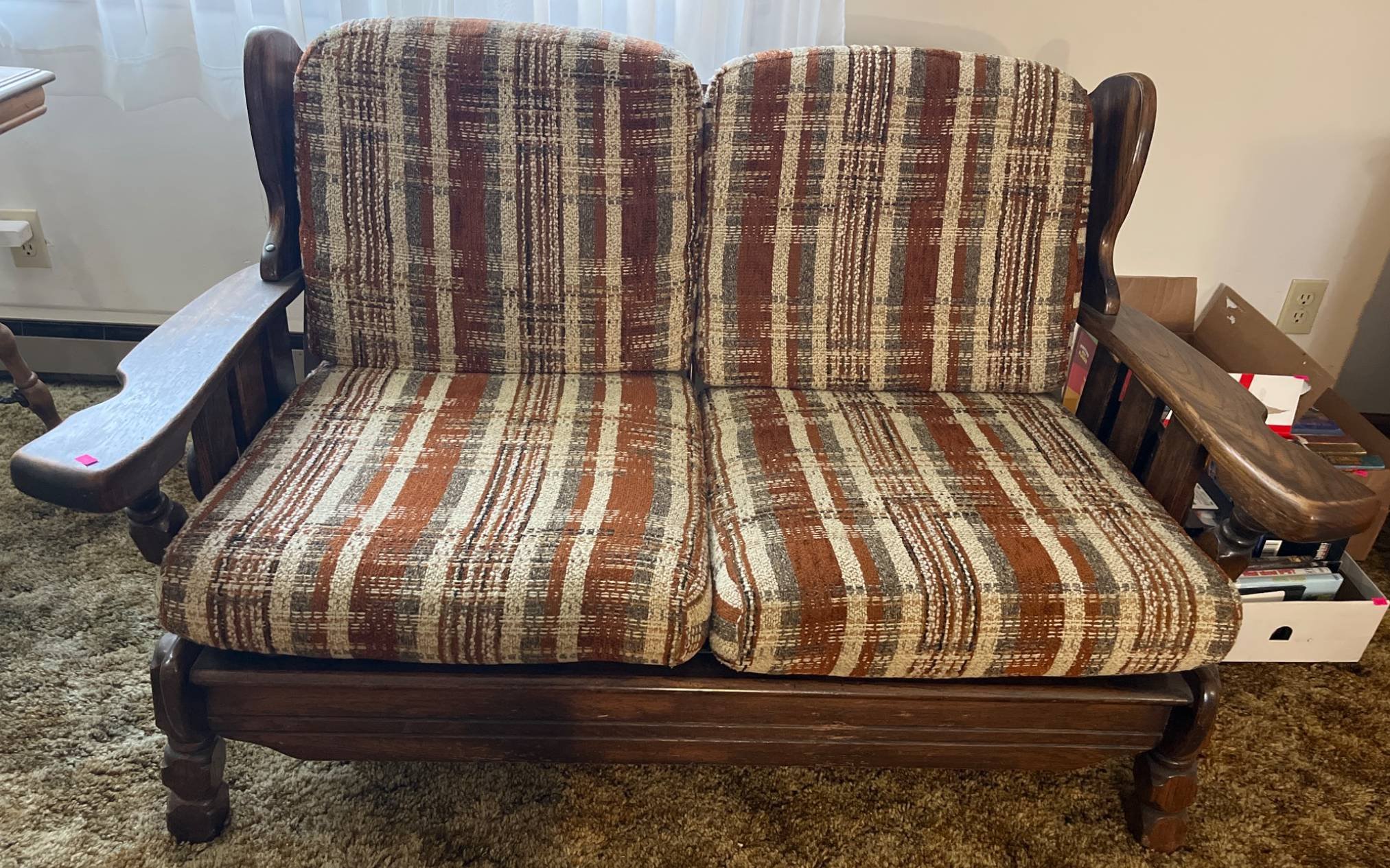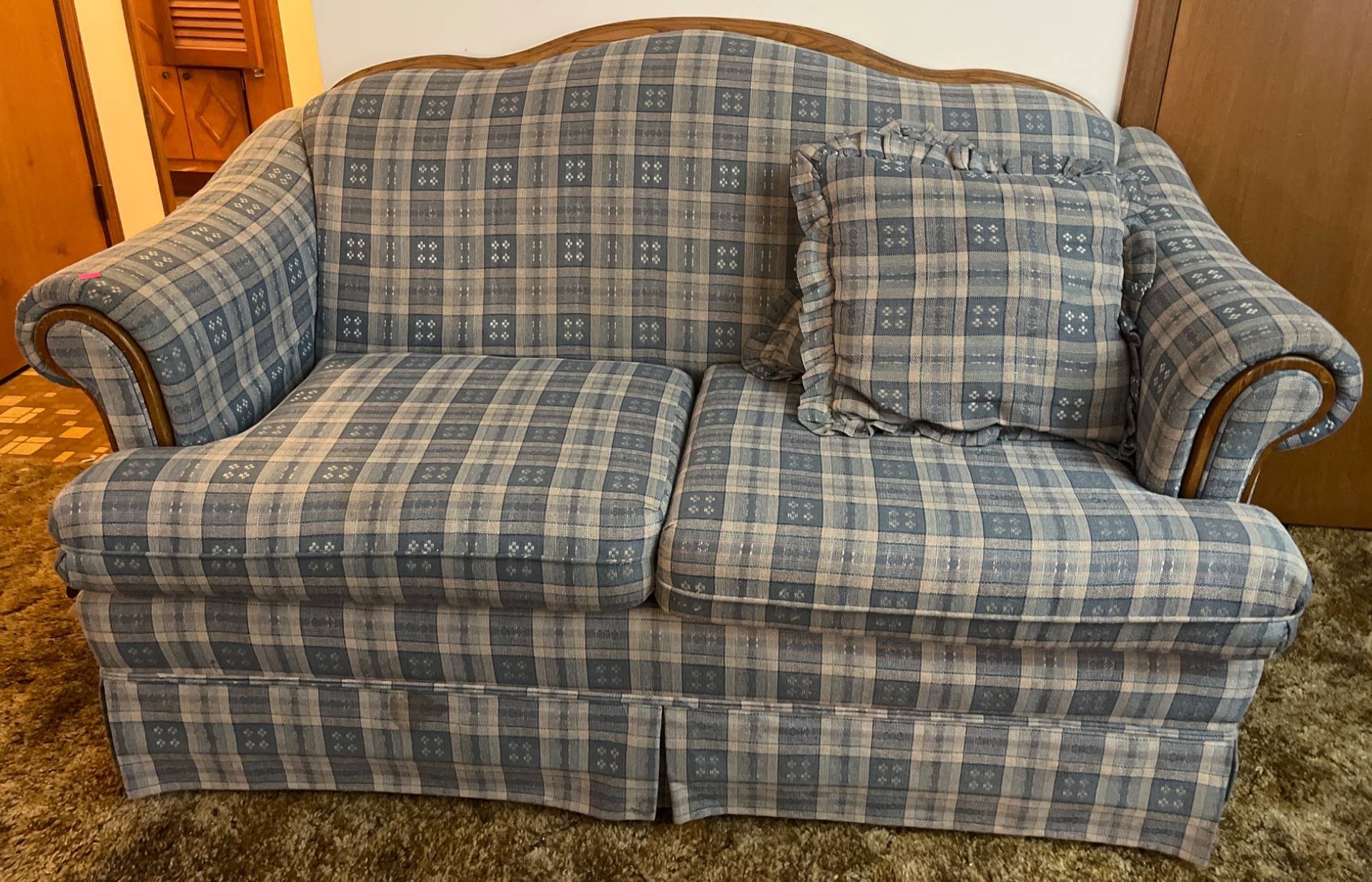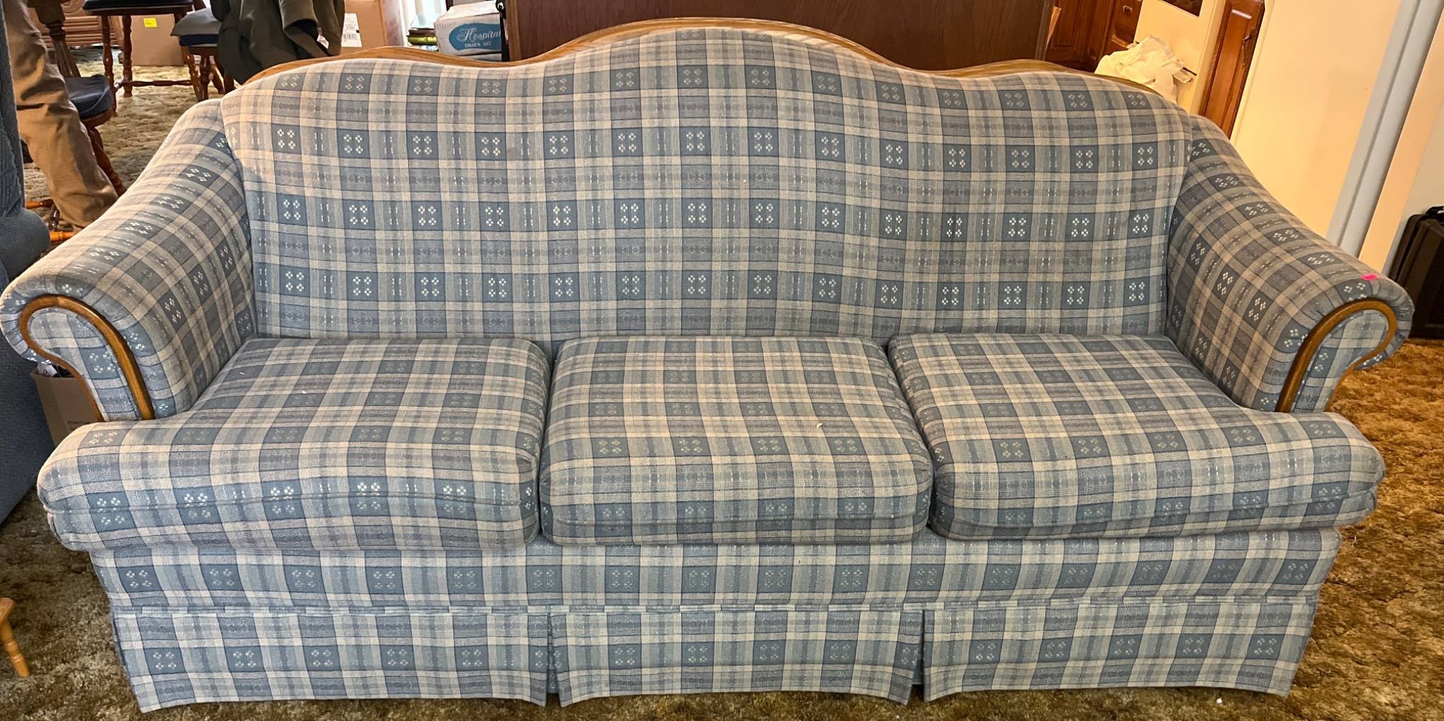 102 Plaid Upholstered Plaid Sofa with Wood-Trimmed Back, 77?