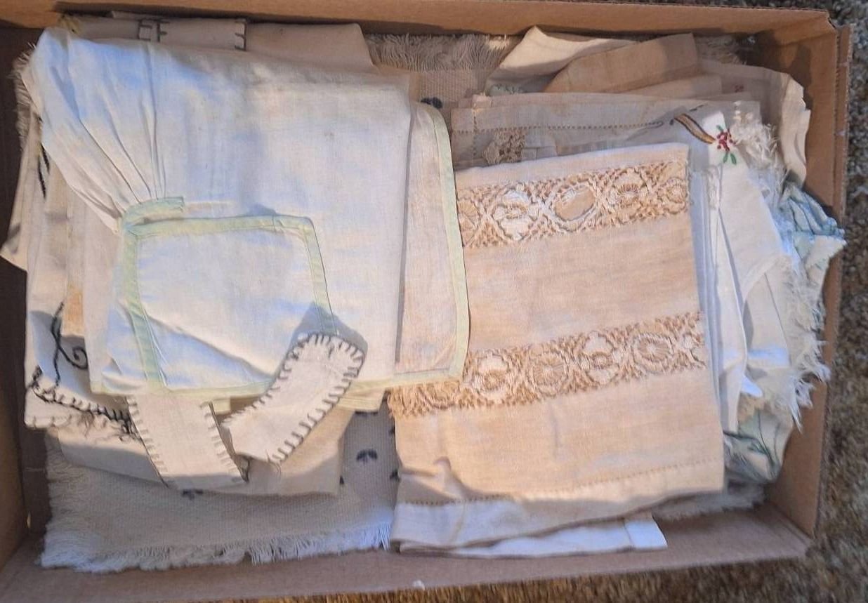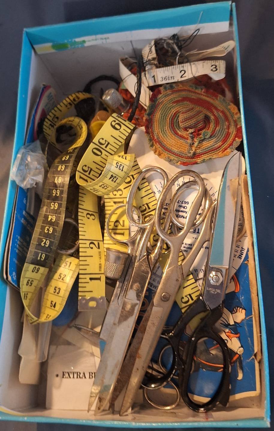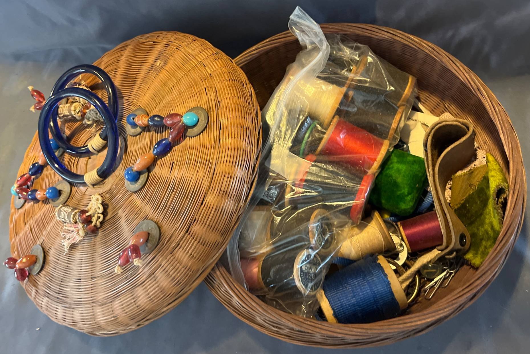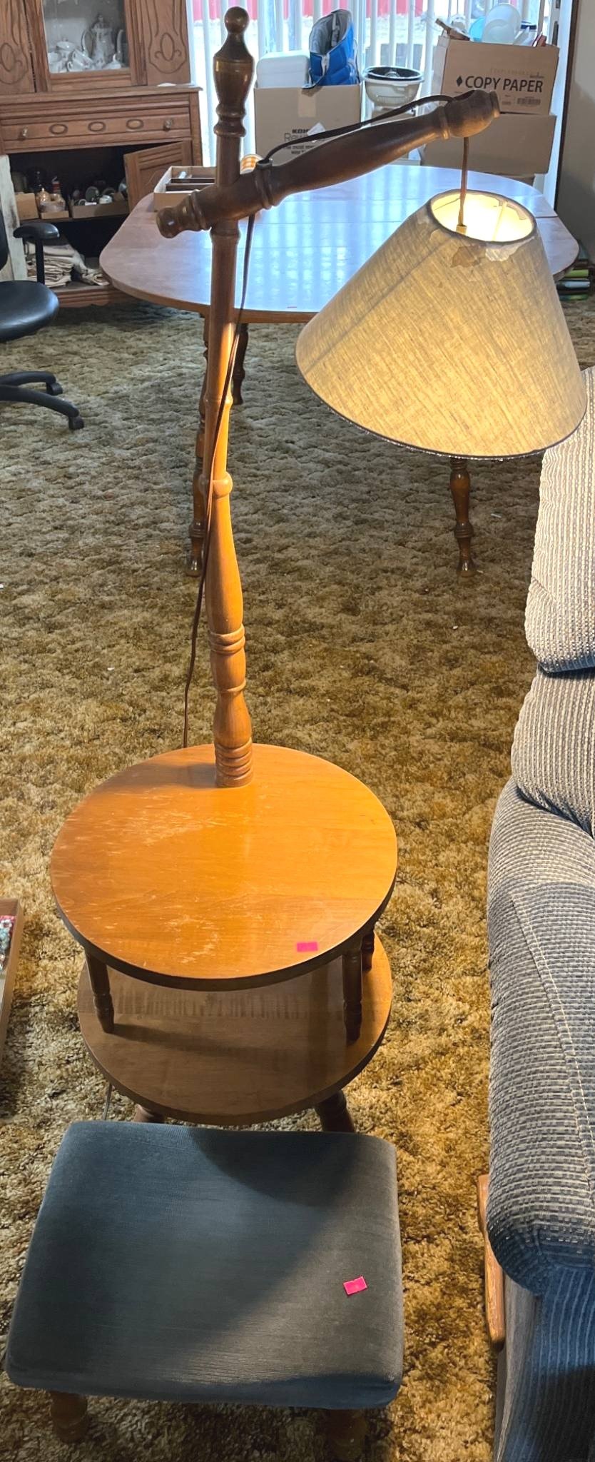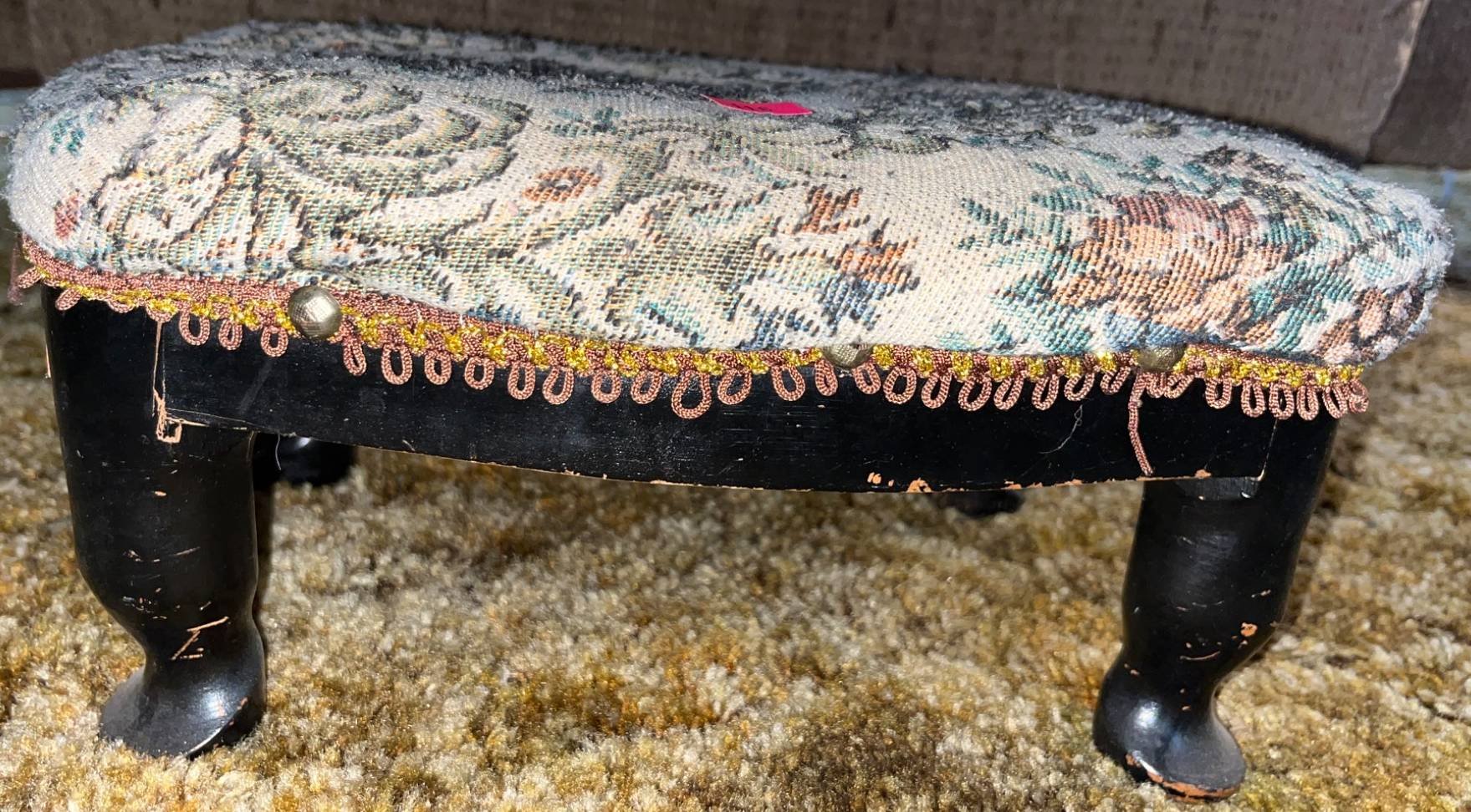 703 Wood Stool with Cushions and Assorted Sewing Items Inc. Thread, Pin Cushion, Lace and Singer Accessories, 19x19x15?