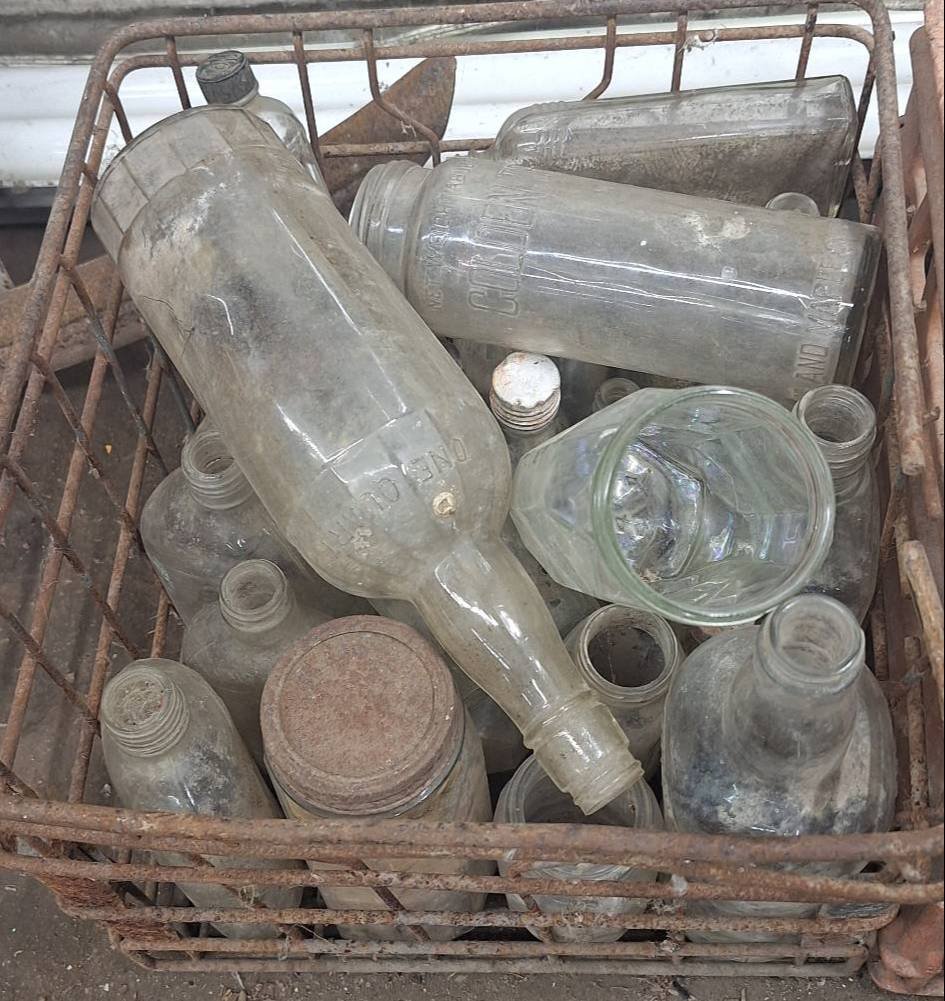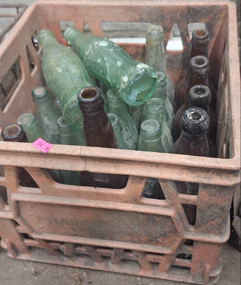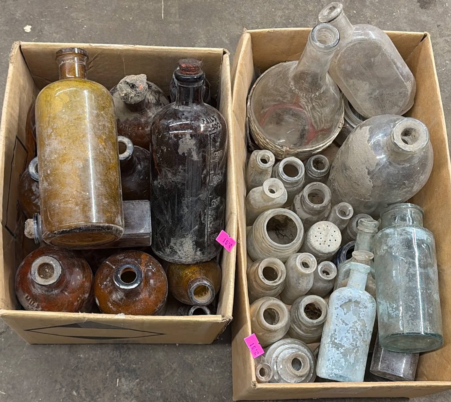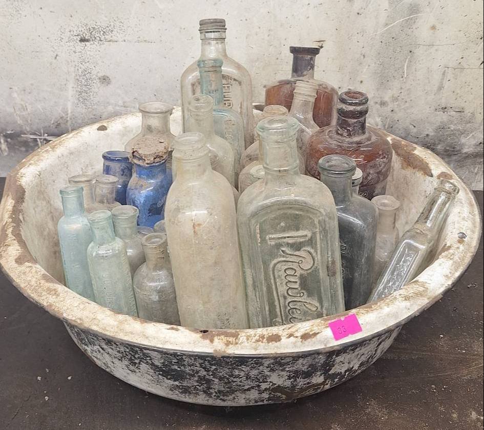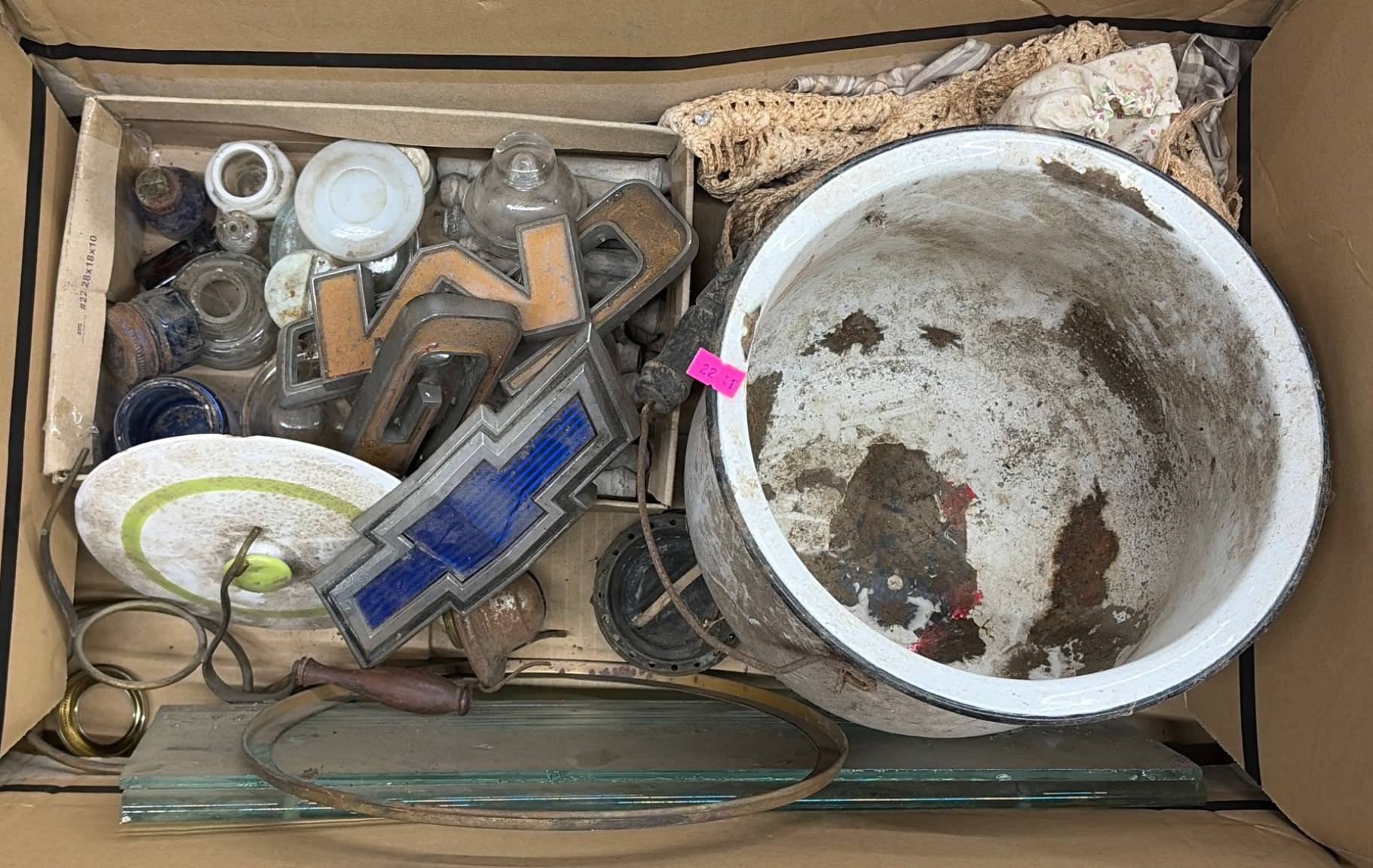 22 Glass Bottles, Enamelware, Chevy & GMC Emblems