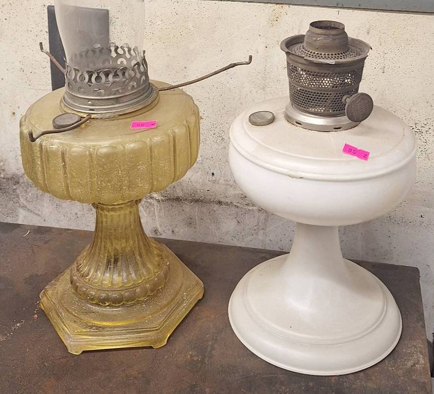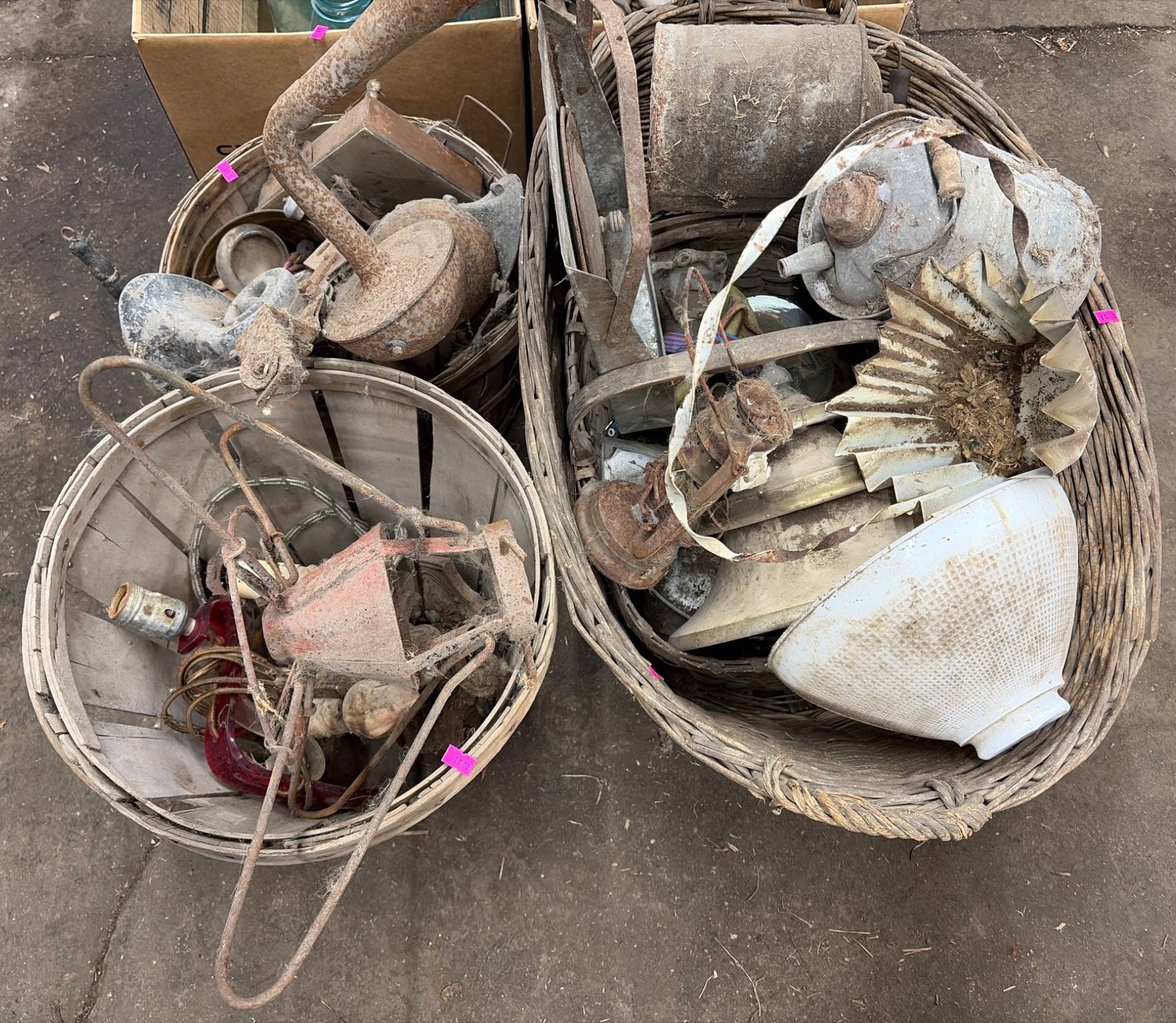 849 Quaker Oats Tin, Kerosene Lamp, and Metal Bicycle Plant Stand
