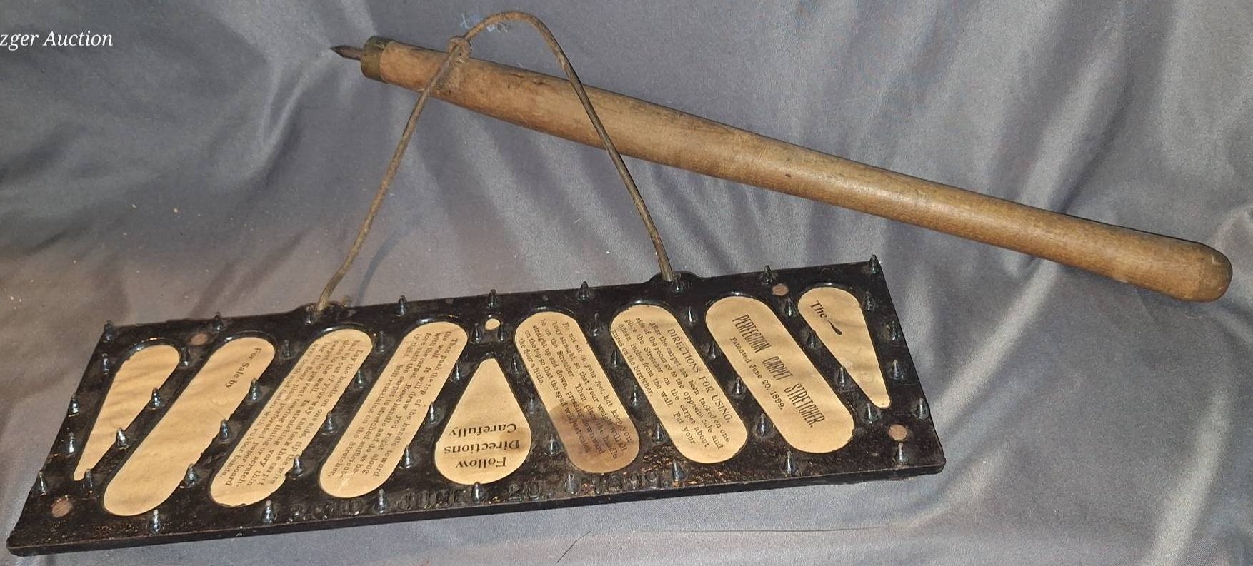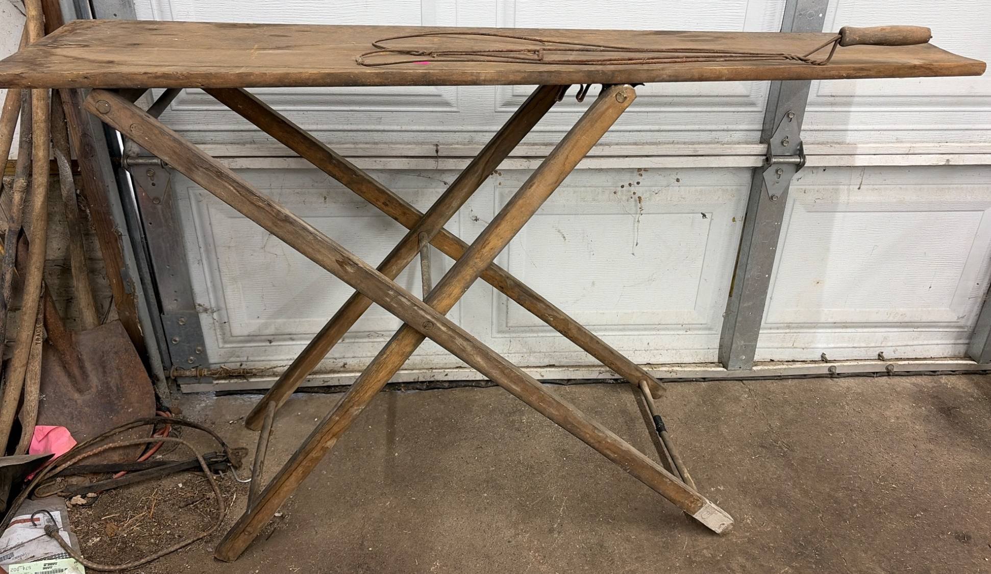 26 Antique Ironing Board, Folds, and Metal Wire Rug Beater, 53?