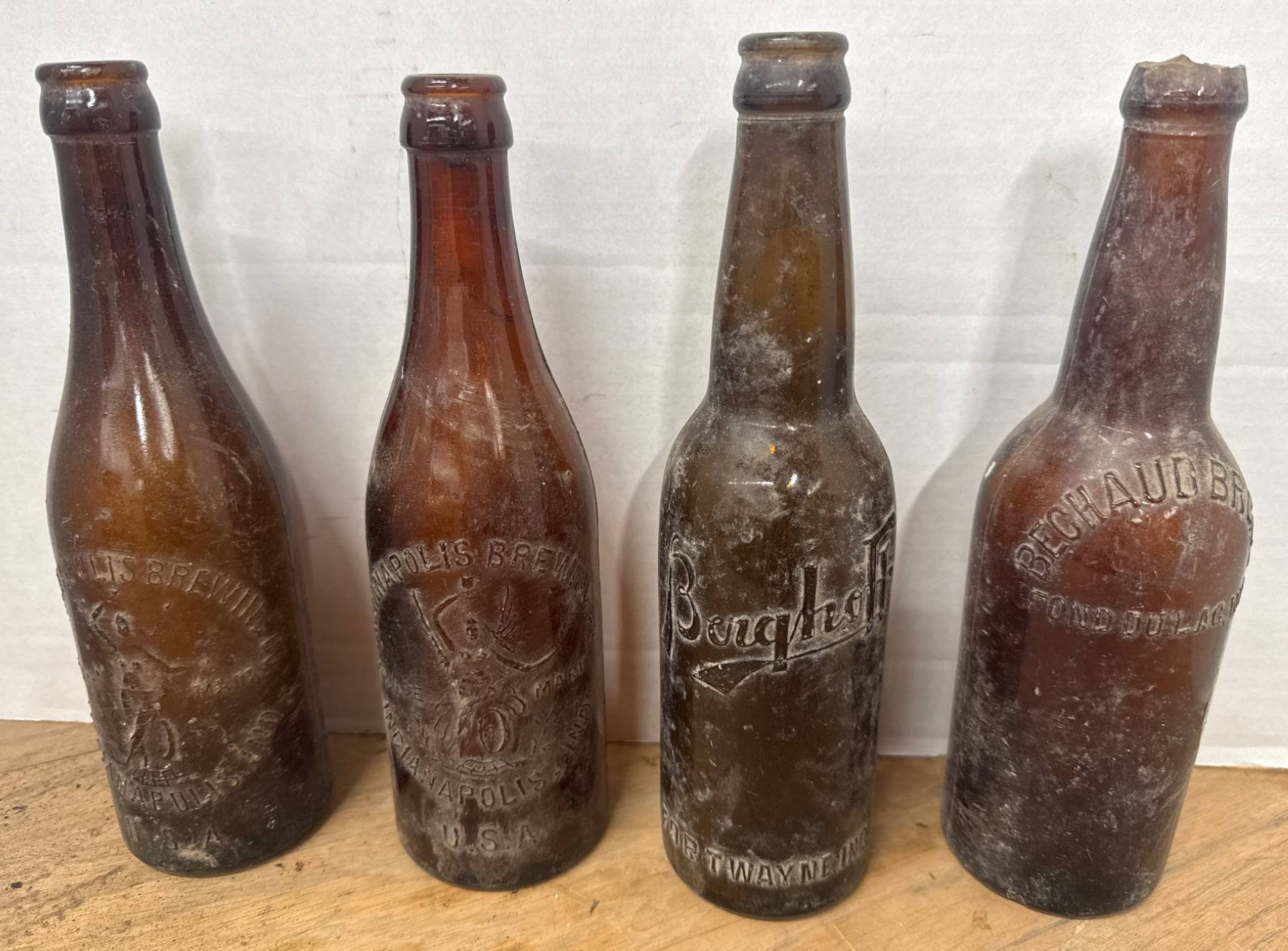 58 4 Embossed Amber Bottles: Indianapolis Brewing Co., Berghoff, Fort Wayne, IN & Brachaud Bros.