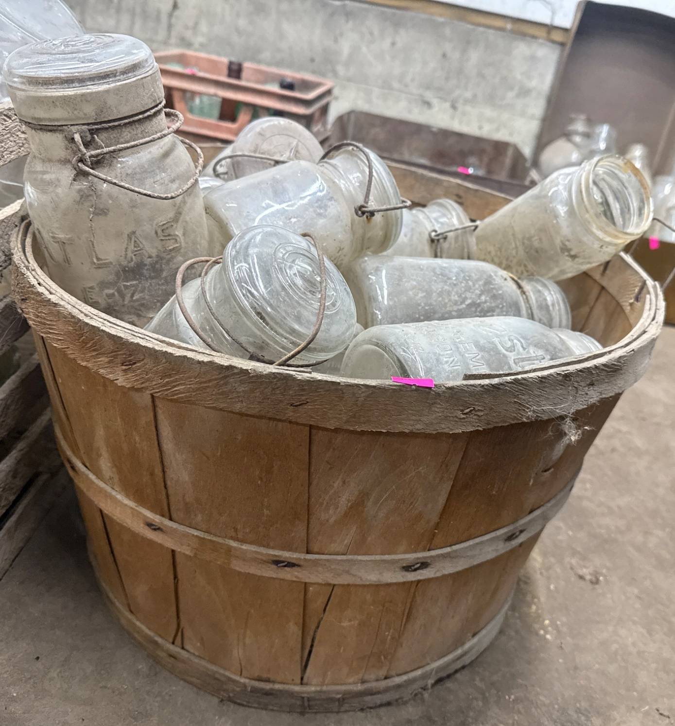 61 Canning Jars by Various Brands Inc. Ball & Atlas in Round Wood Basket, Quart and Pint Size