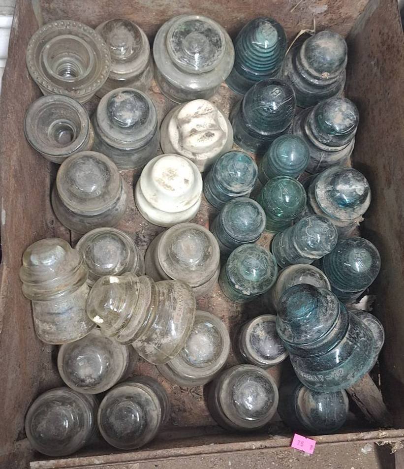 75 Glass Electrical Insulators in Clear and Green Hues, Mostly Hemingray