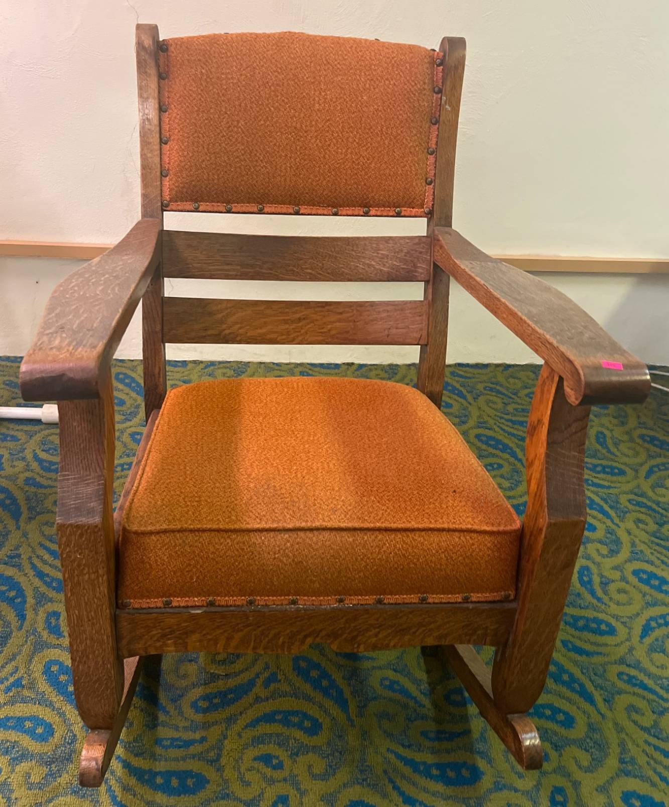 102 Mission Style Rocking Chair with Orange Upholstery and Ladder-Back Design, 26×23?