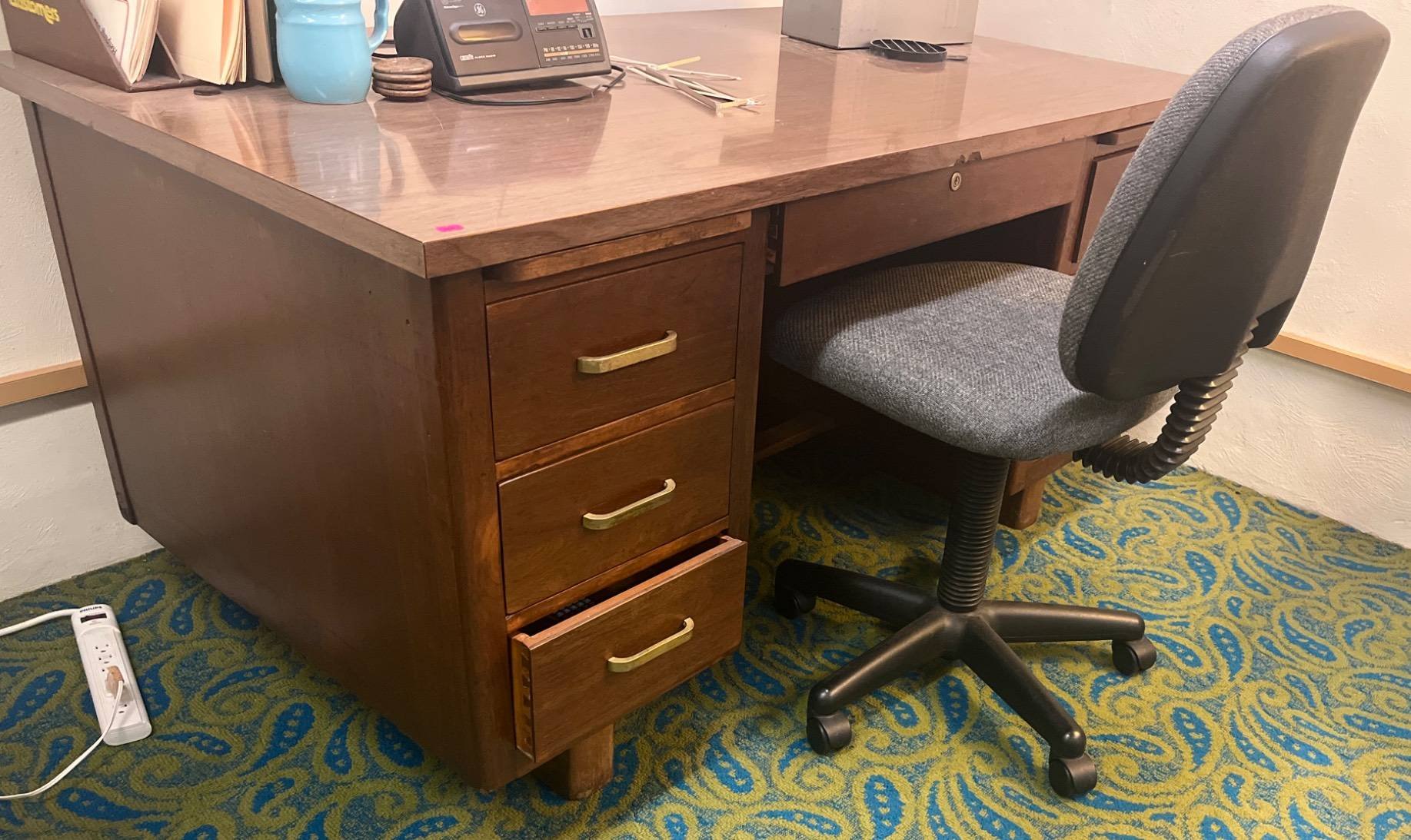 104 Desk with Brass Drawer Pulls and Upholstered Office Chair, 60x34x30?, 21×20?