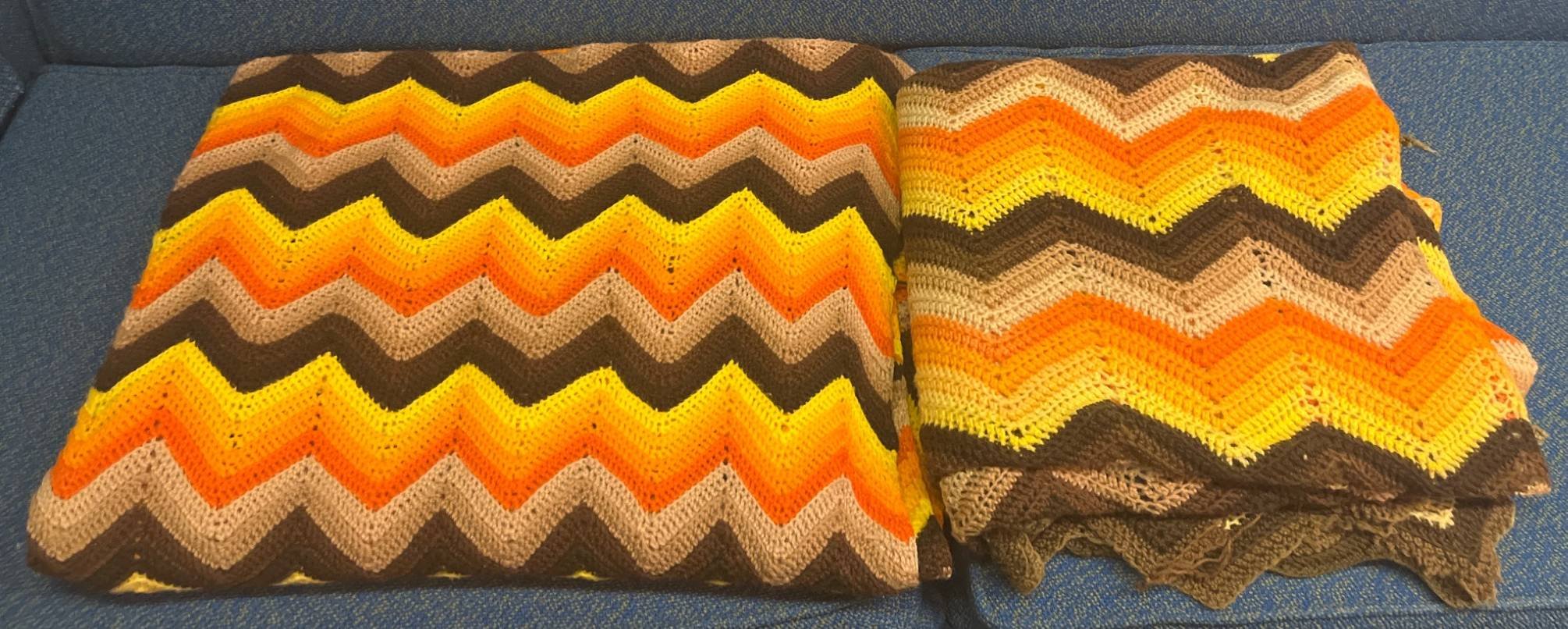 107 2 Crochet Chevron Pattern Blanket in Yellow, Orange, Brown, and Cream Tones, 74×43?, 56×66?