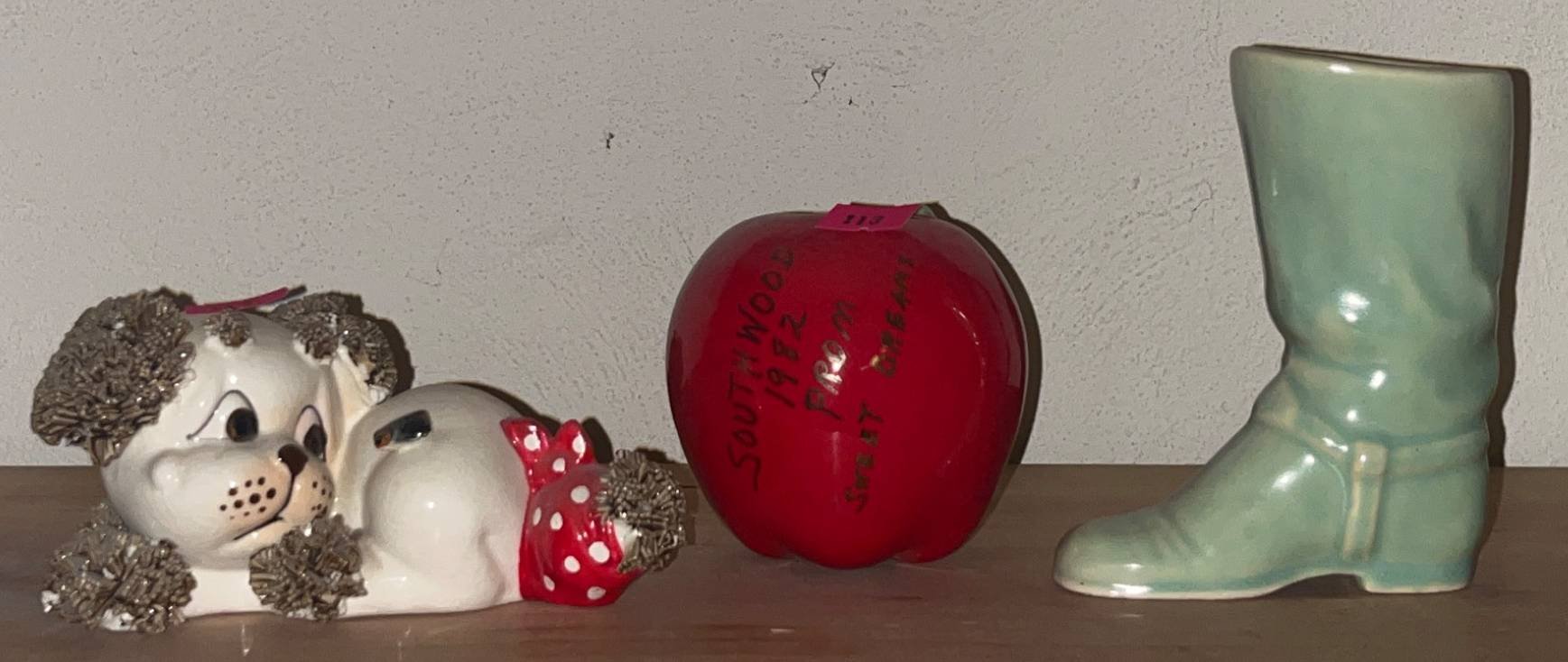 113 Lefton Spaghetti Dog, Apple Marked “Southwood 1982 Prom Sweet Dreams” and Shawnee Style Pottery Cowboy Boot, 3-4?