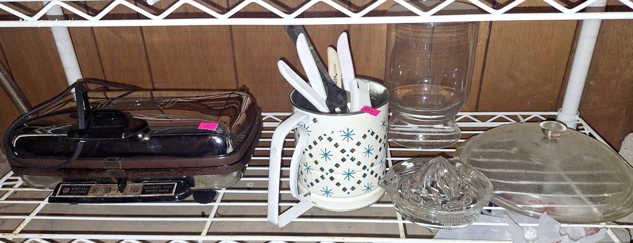 121 Retro Sifter, 4-Pioneer Seed Knives, Glass Juicer, General Electric Grill and Glassware