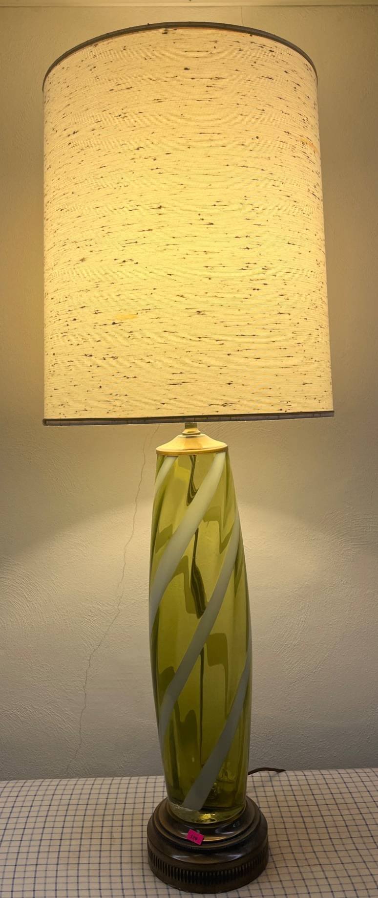 126 Retro Green Glass Lamp with Swirled White Design and Drum Shade, 41?
