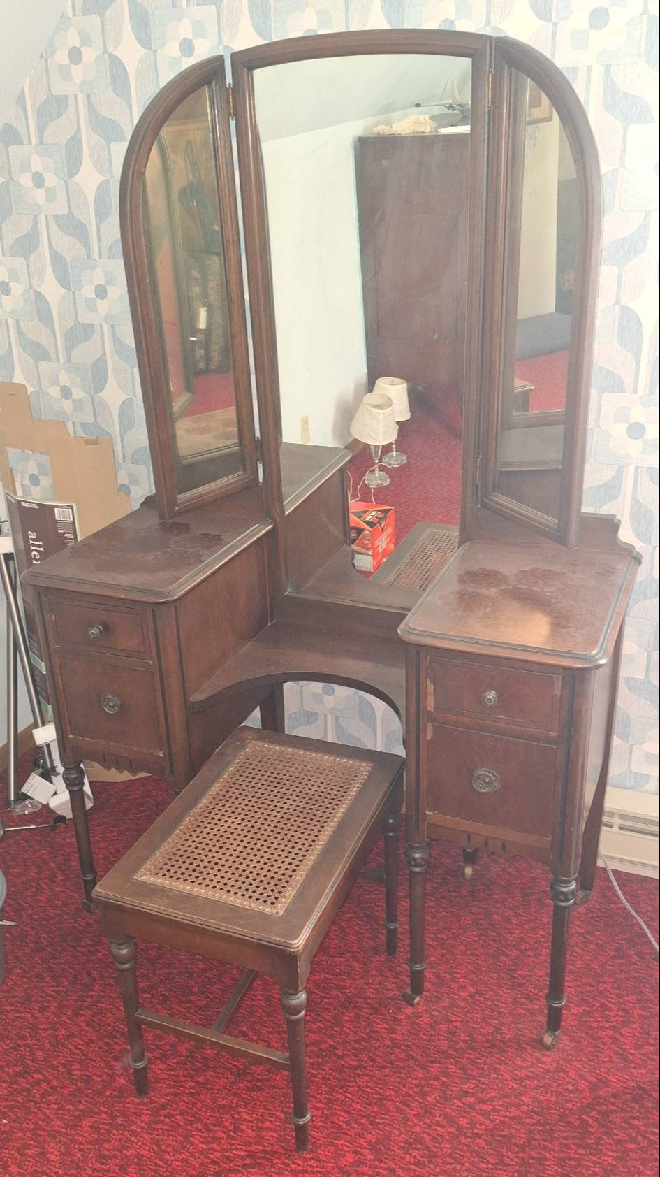 205 Vanity Table with Trifold Mirror, Drawers, and Cane-Seat Stool, 42x18x65?