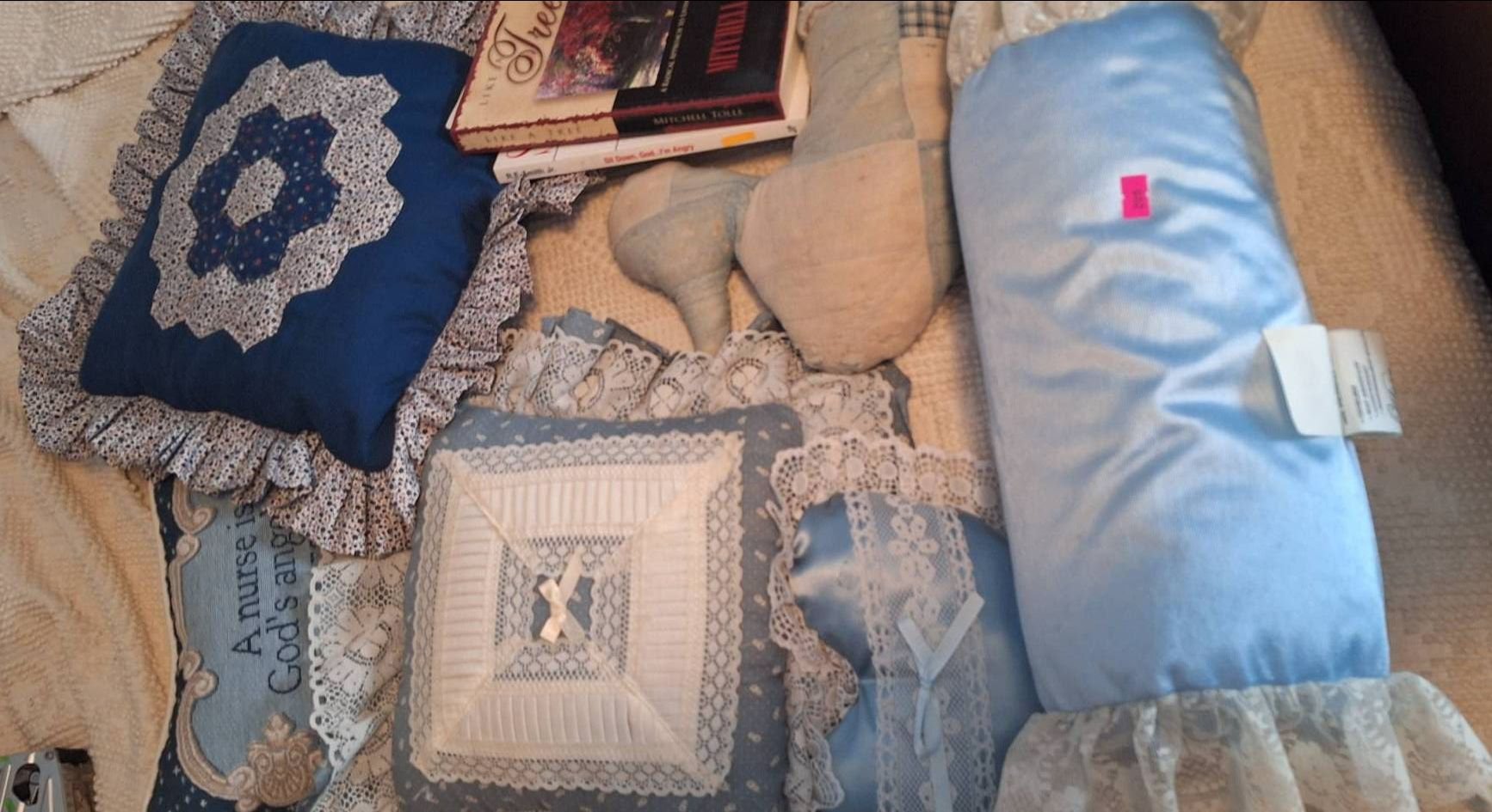 209 Pillows with Lace Accents and Books by Mitchell Tolle