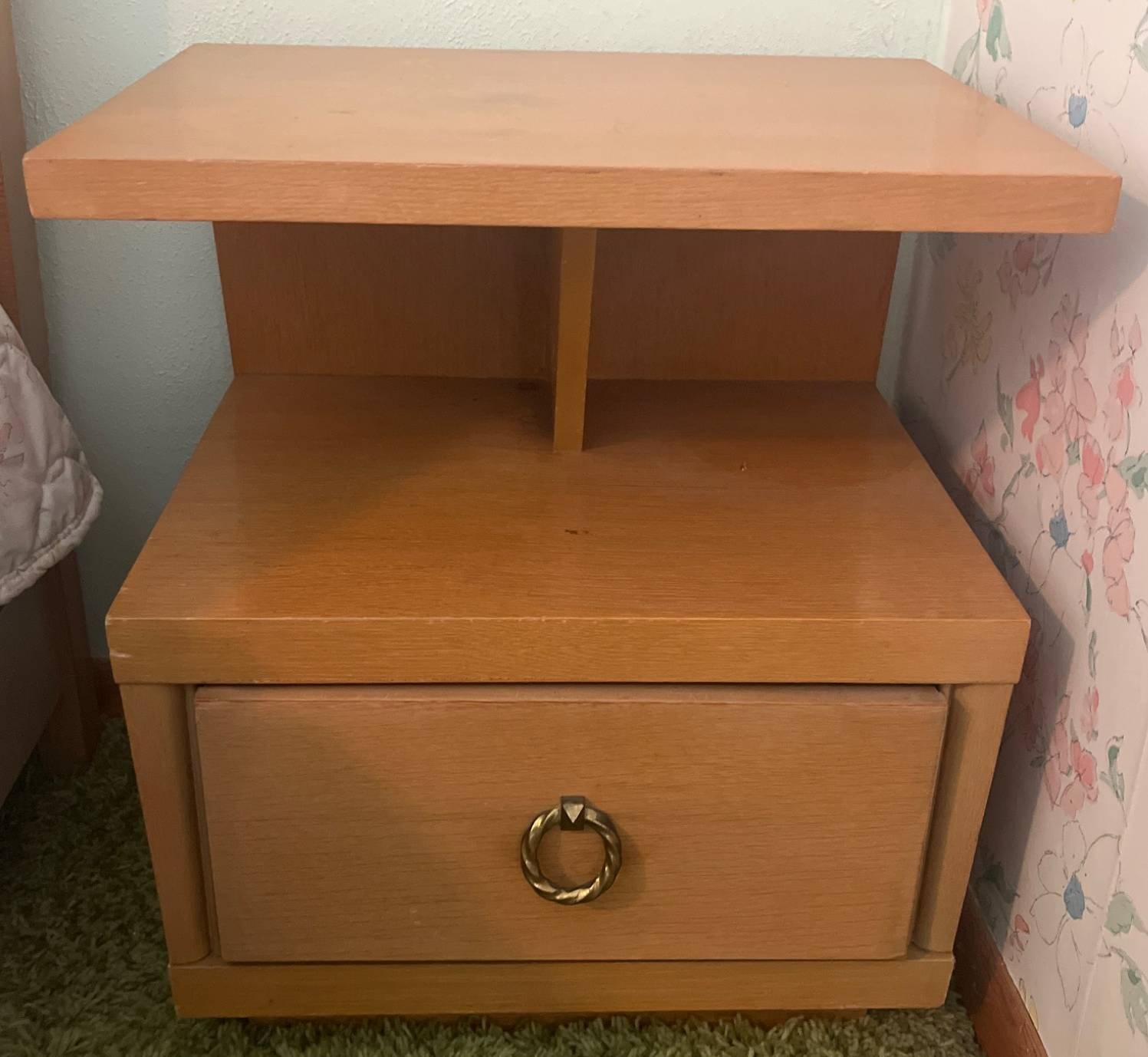 254 Blonde Retro Two-Tier Nightstand with Drawer and Brass-Tone Pull, 22x16x25?