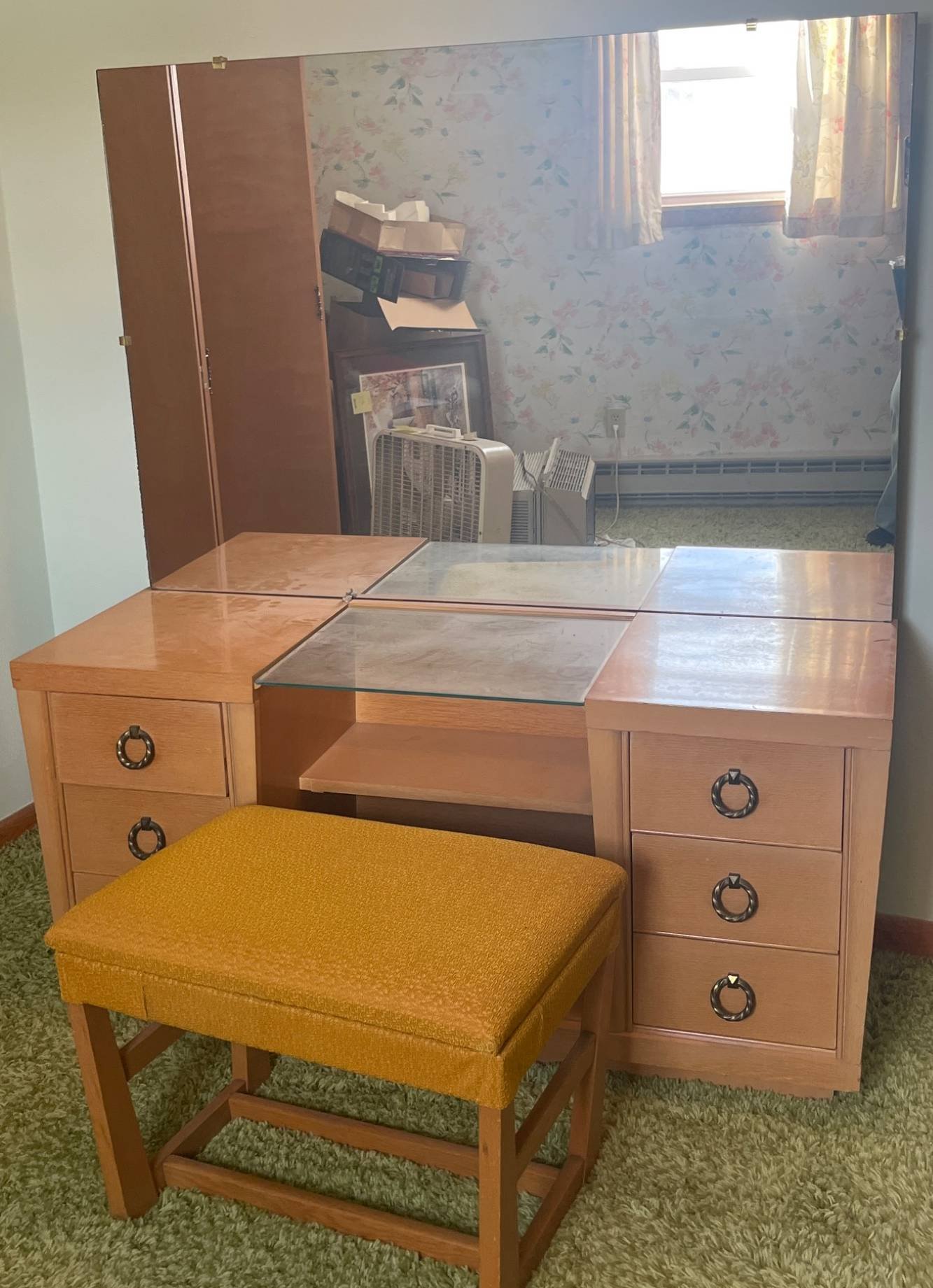 255 Blonde Retro Vanity Dresser with Mirror and Upholstered Bench, 53x18x25?, 52×36?, 25x17x17.5?
