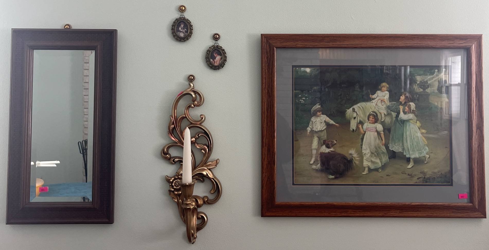 301 Wall-Mounted Mirror, Framed Print, Brass-Tone Candleholder, and Oval Portrait Miniatures