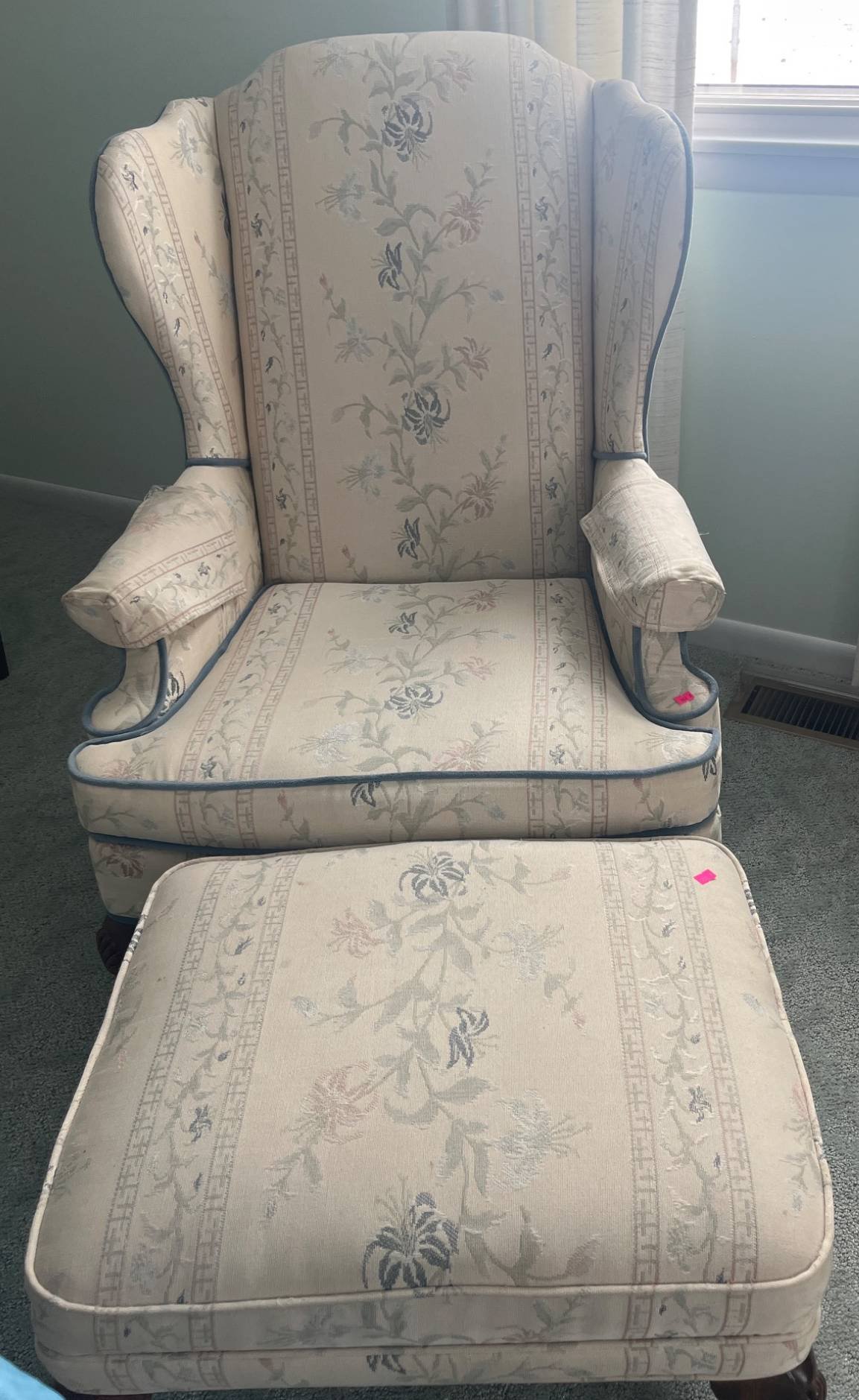 302 Flexsteel Wingback Chair and Ottoman with Floral Upholstery, 28×23?, 18x24x15?