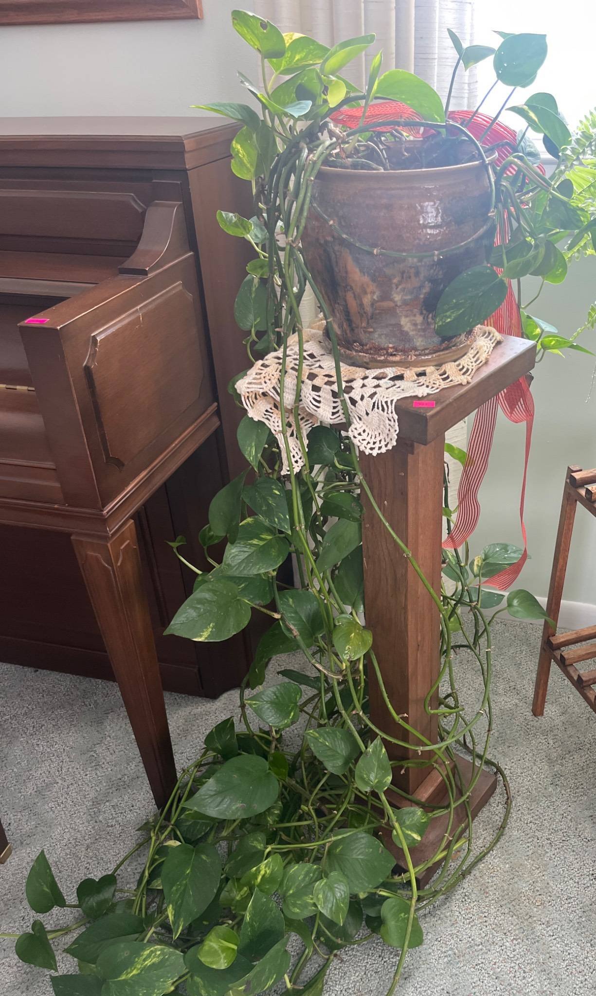 303 Brown Stoneware Planter with Pothos Plant on Pedestal Stand, 9x9x31.5?