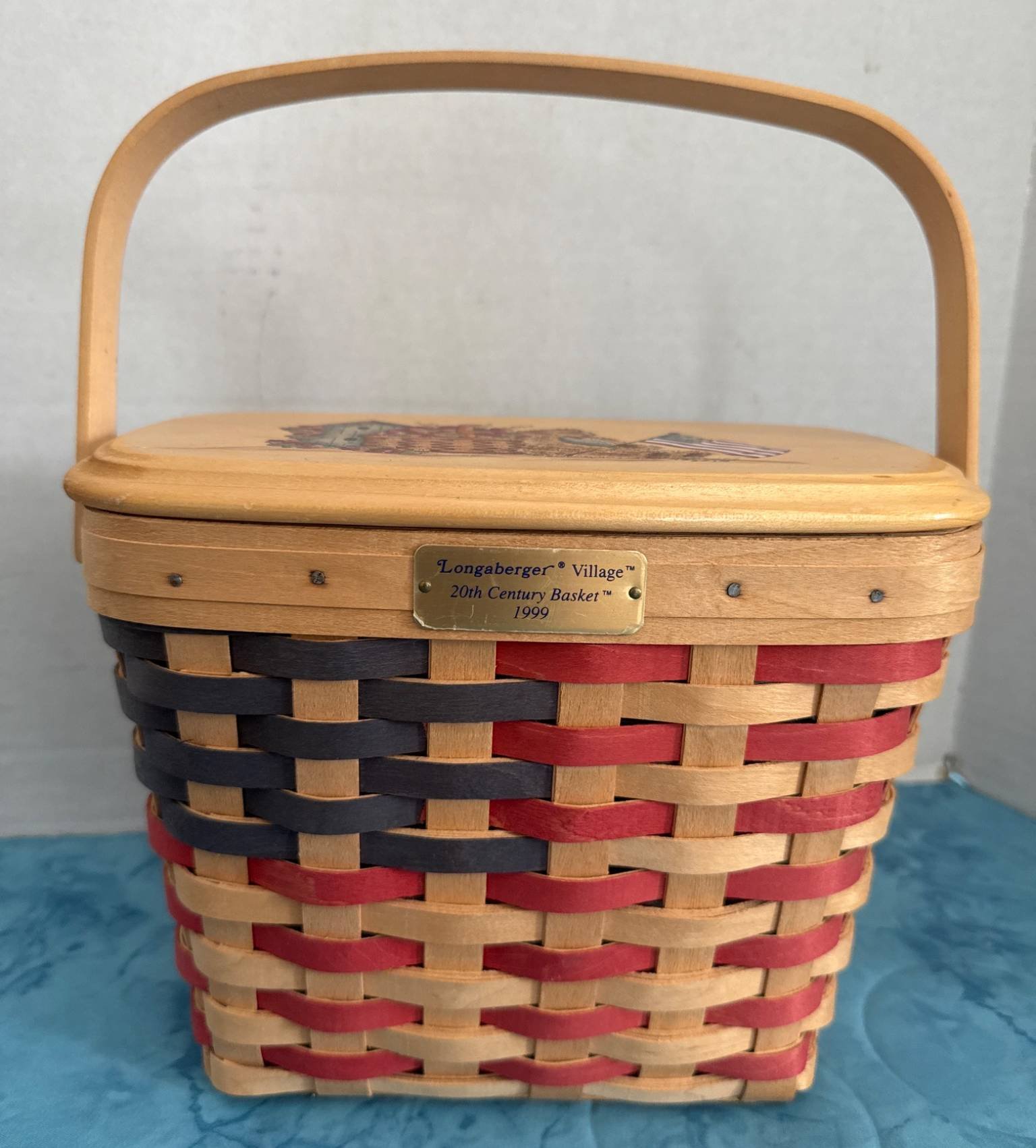 313 Longaberger Village 20th Century Basket with Patriotic Color Design and Lid, 7.5×9?