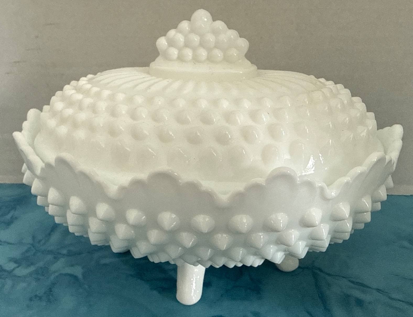 320 Fenton Hobnail Milk Glass Oval Covered Candy Dish, 6×7 Inches