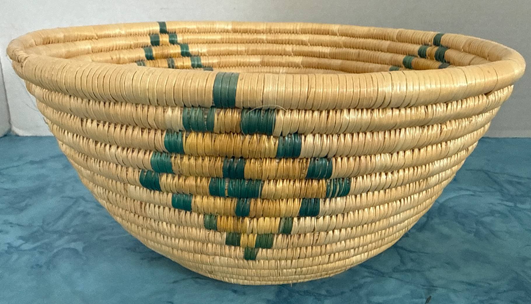 321 Native American Style Handwoven Natural Fiber Basket with Green Accents, 4.5?