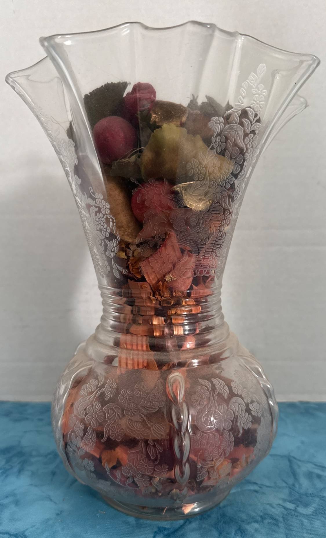 323 Clear Glass Vase with Floral Etching and Potpourri, 10×7?