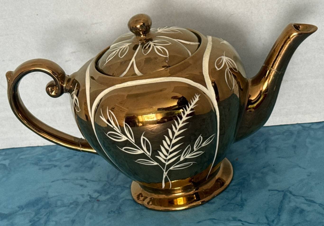 326 Arthur Wood Gold-Toned Teapot with Hand-Painted White Pattern, 6”x10”