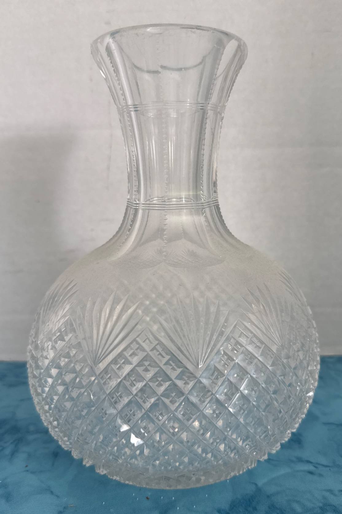 328 American Brilliant Cut Glass Carafe with Geometric and Starburst Patterns, 9”x6”