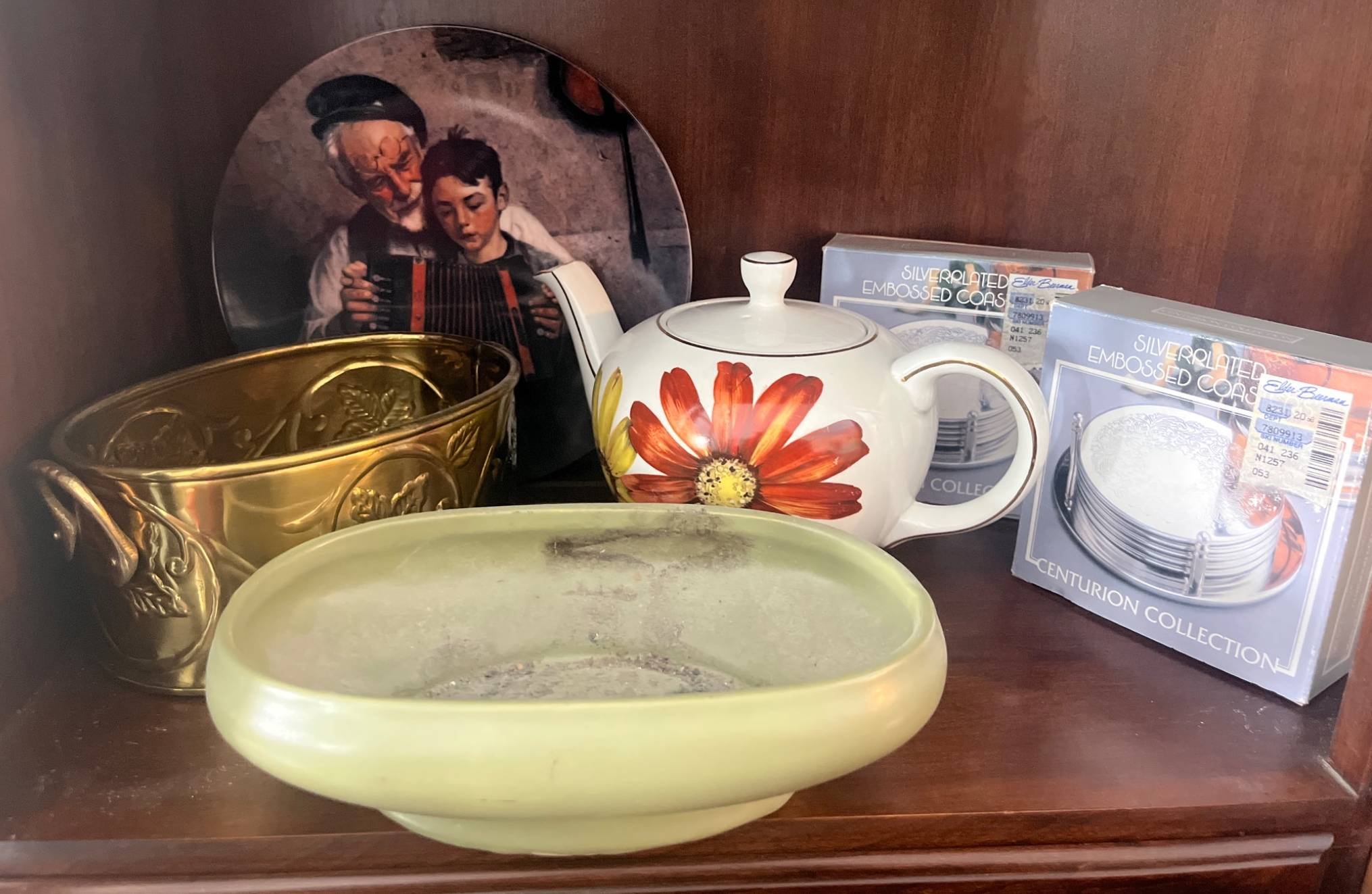 335 Norman Rockwell Collector Plate, Floraline Planter, ELI Greave Teapot, Centurion Coasters, and Ames Brass Container