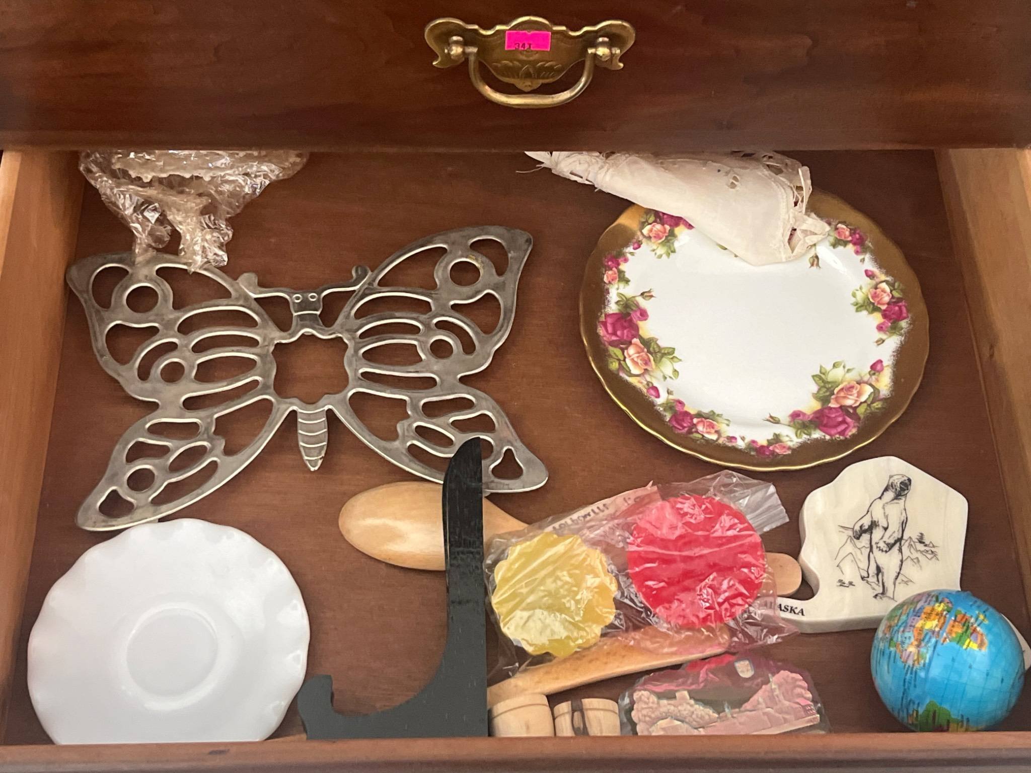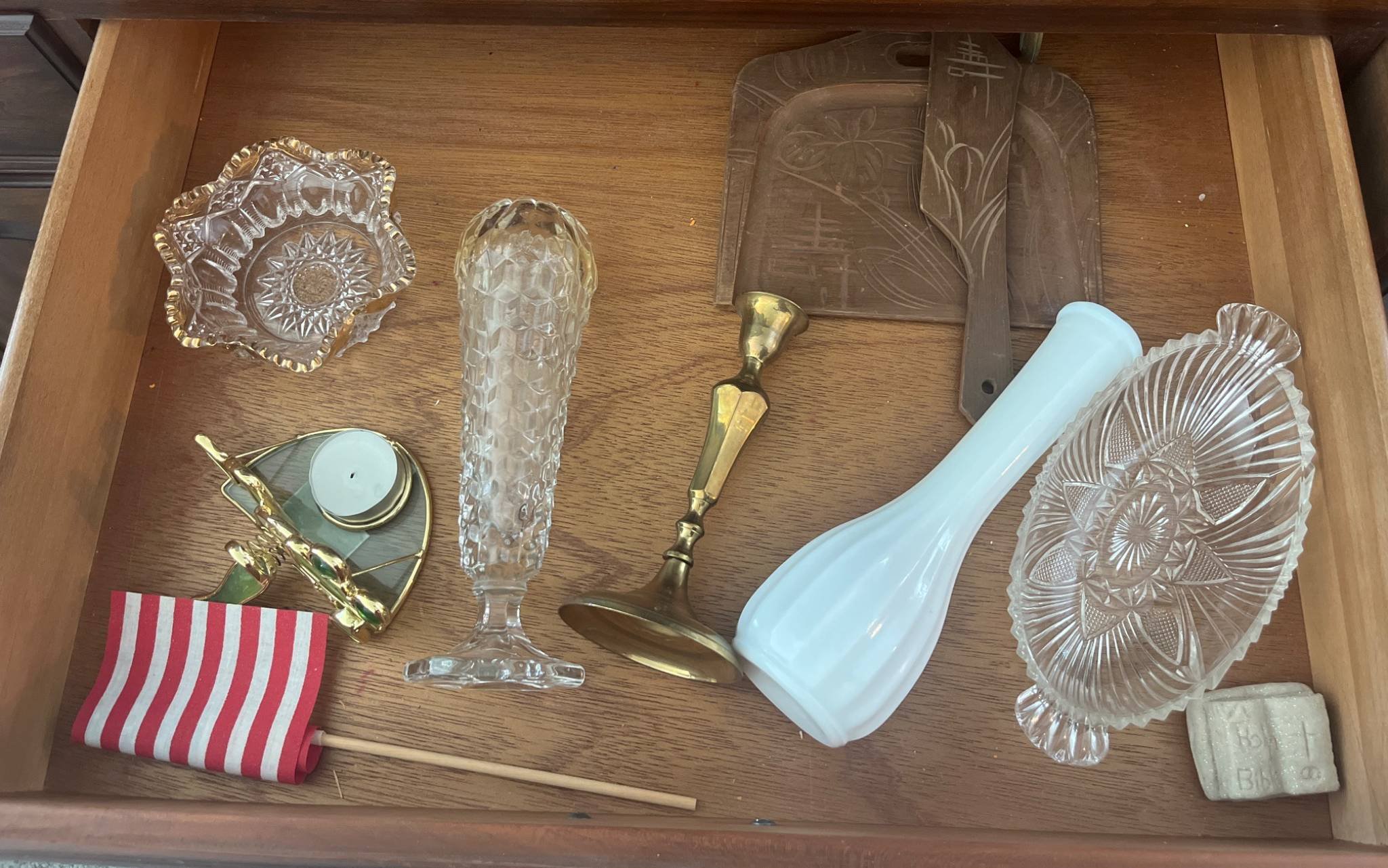 339 Brass Candlesticks, Glassware, Vase and Wood Crumb Pan