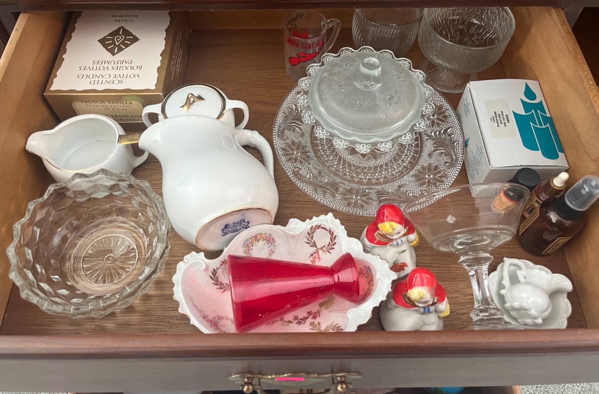 340 Glass Pedestal Dishes, Covered Candy Dish, Creamer, Sugar and Trinkets