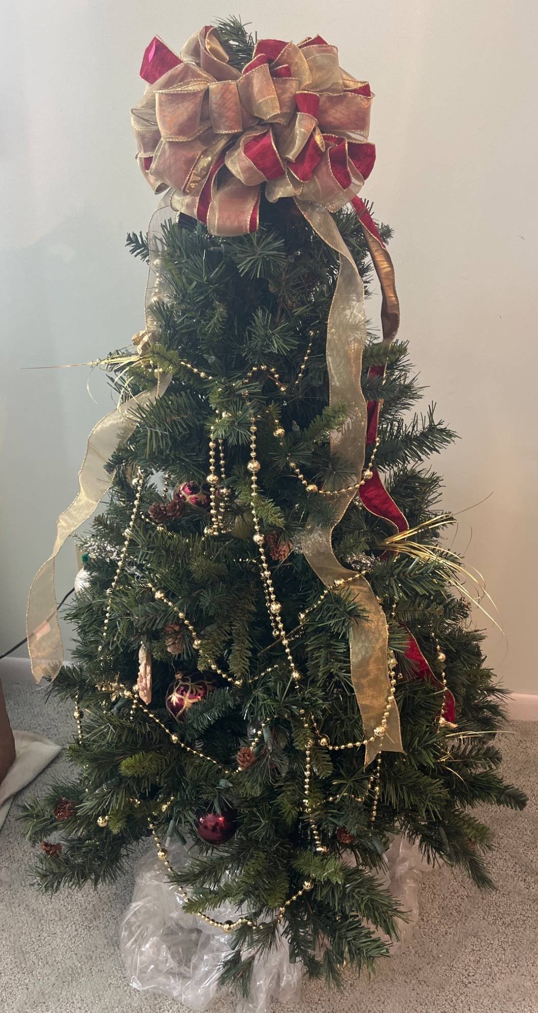 348 Artificial Christmas Tree with Ribbon, Ornaments, and Bead Garland, 54?