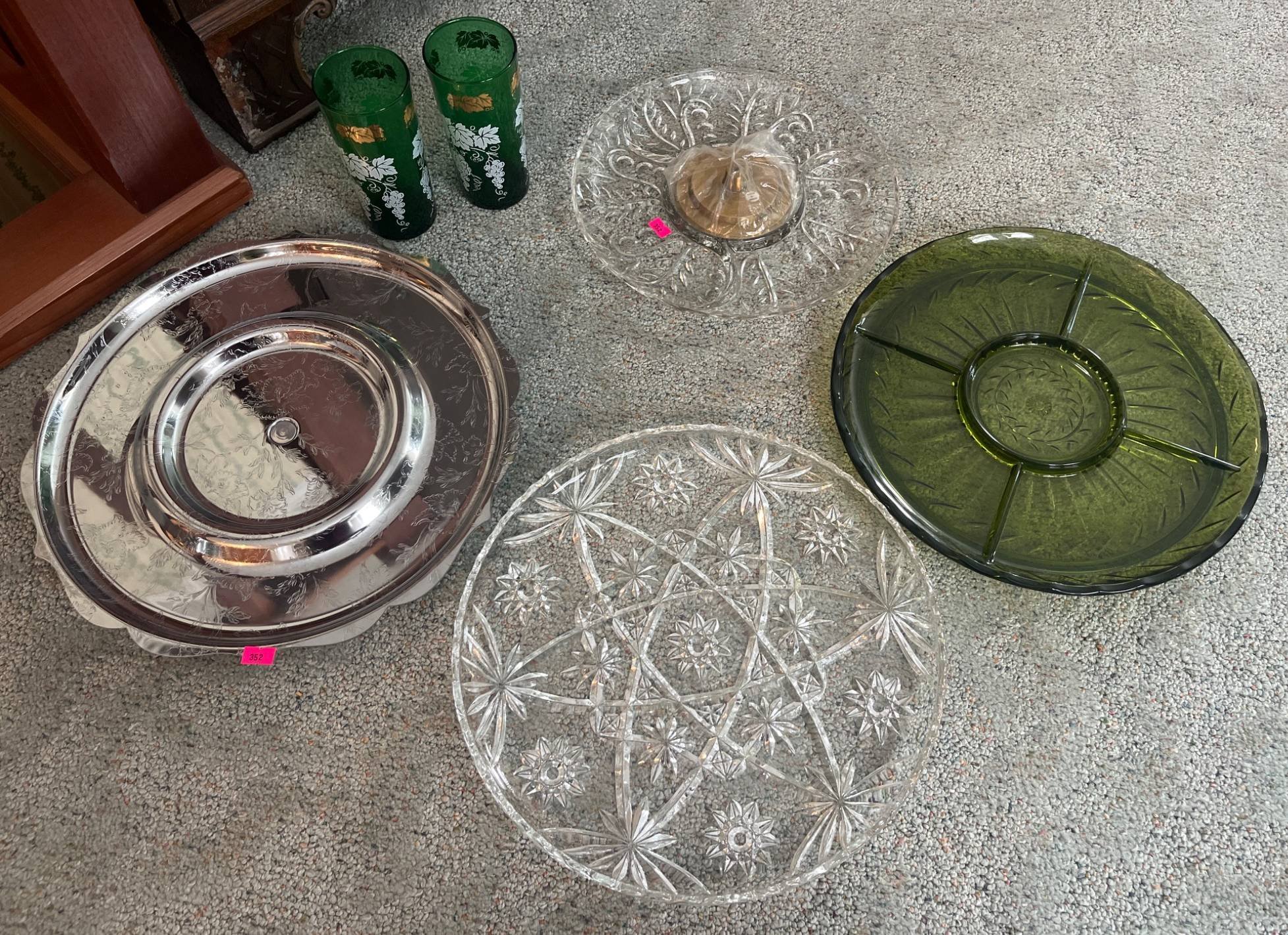 352 Glass Serving Pieces, Silver Toned Lazy Susan and Anchor Hocking Beverage Tumblers with Grape Motif