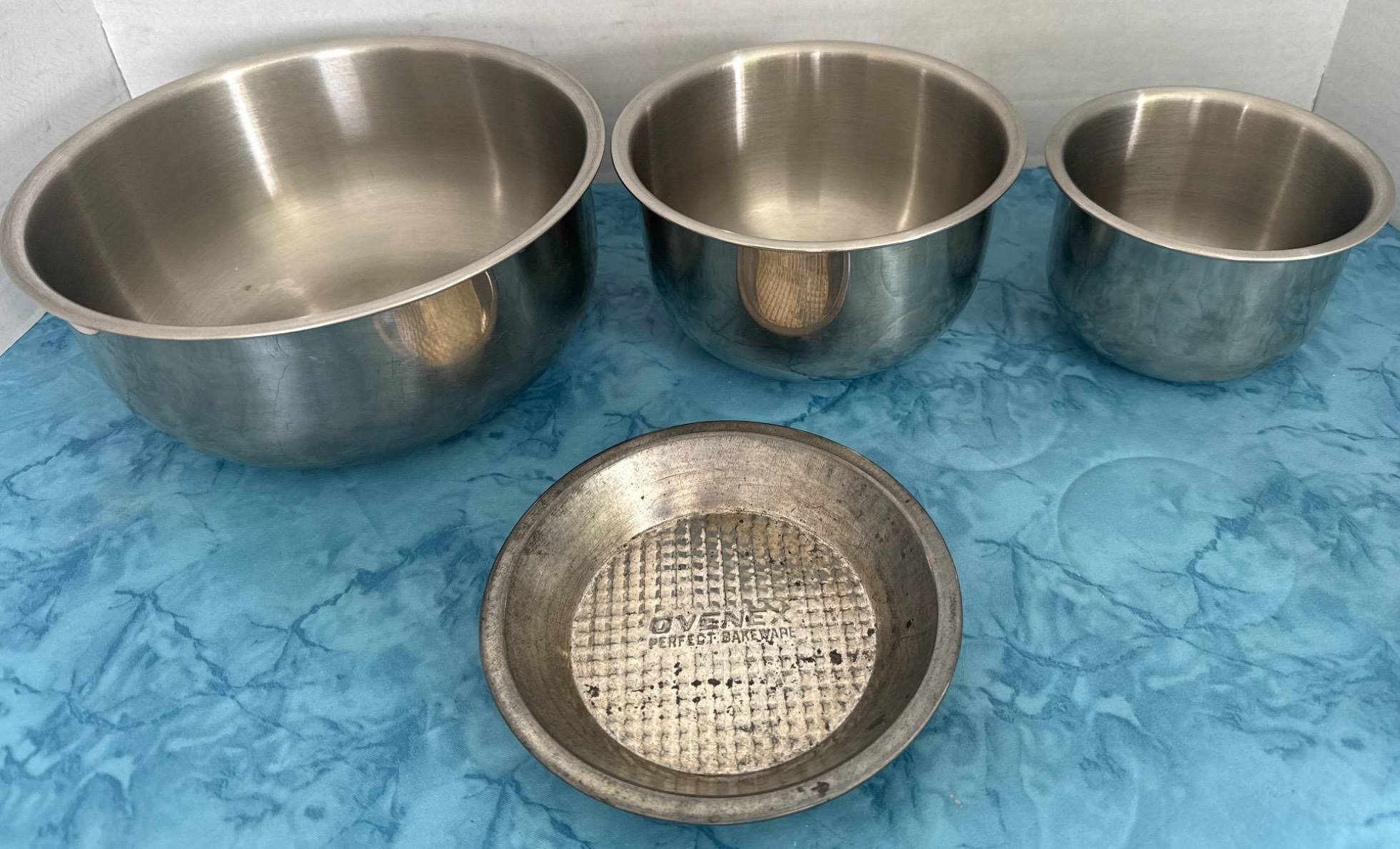 359 3 Vollrath Stainless Steel Mixing Bowls and 1 Ovenex Pie Tin