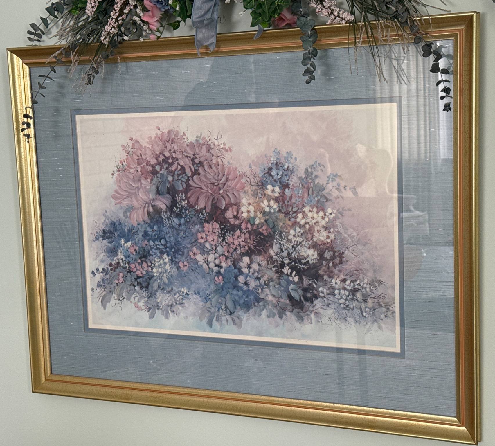 370 Floral Print Artwork in Gold Frame with Blue Matting 34.5×26?