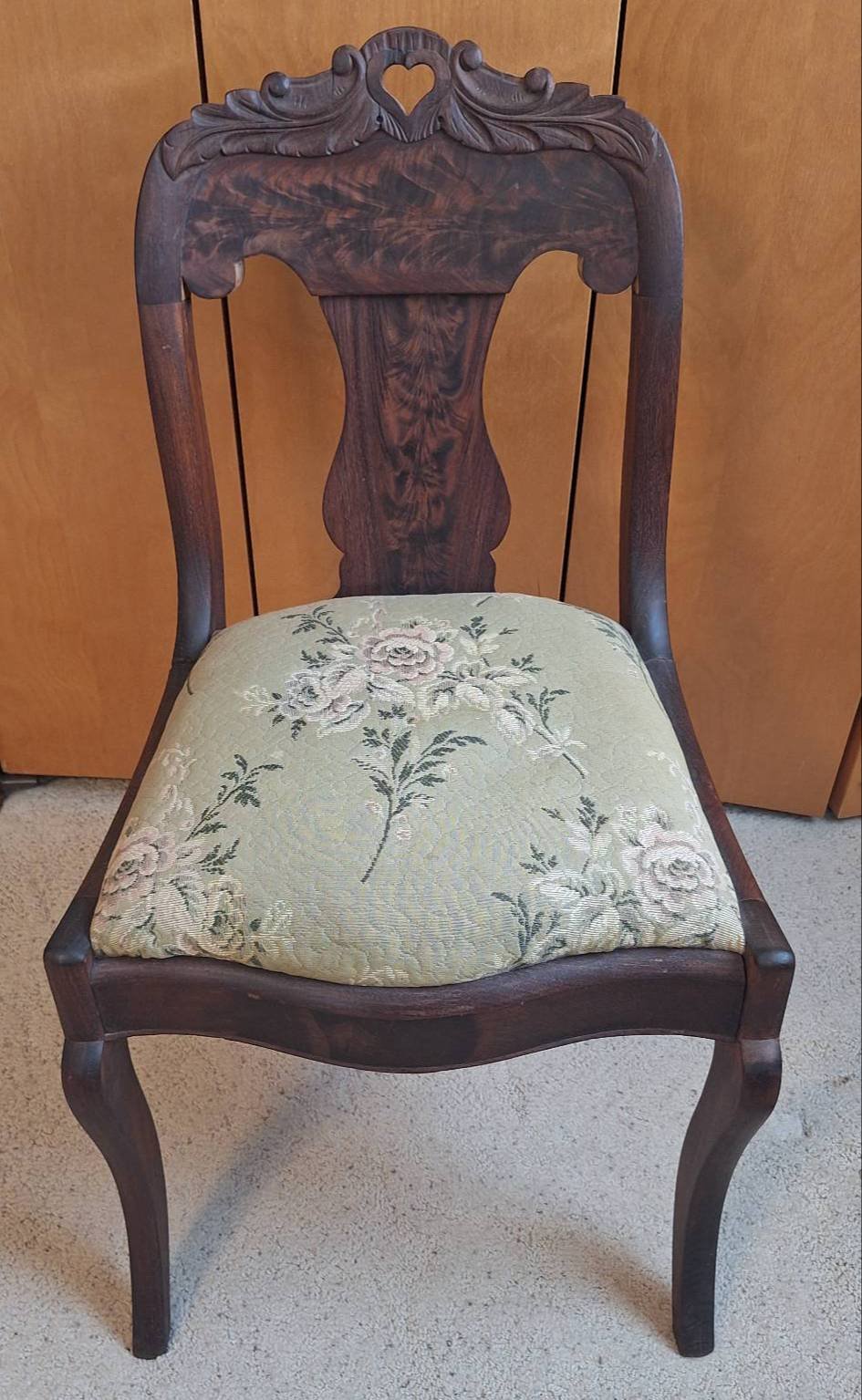 507 Carved Sewing Chair with Heart Motif Backrest and Floral Upholstered Seat 18×31?
