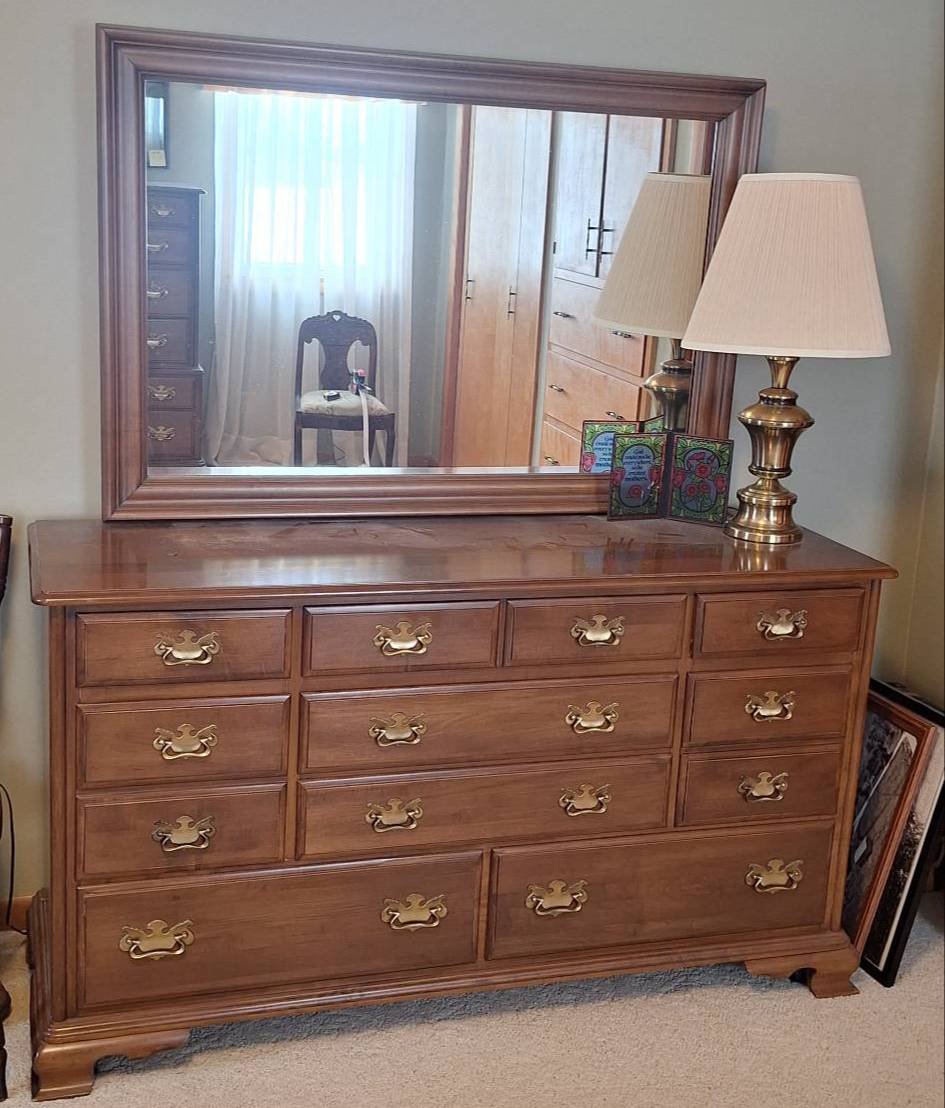 508 Taylor Jamestown Dresser with Mirror and Brass Hardware, lamp not included 60x68x20?