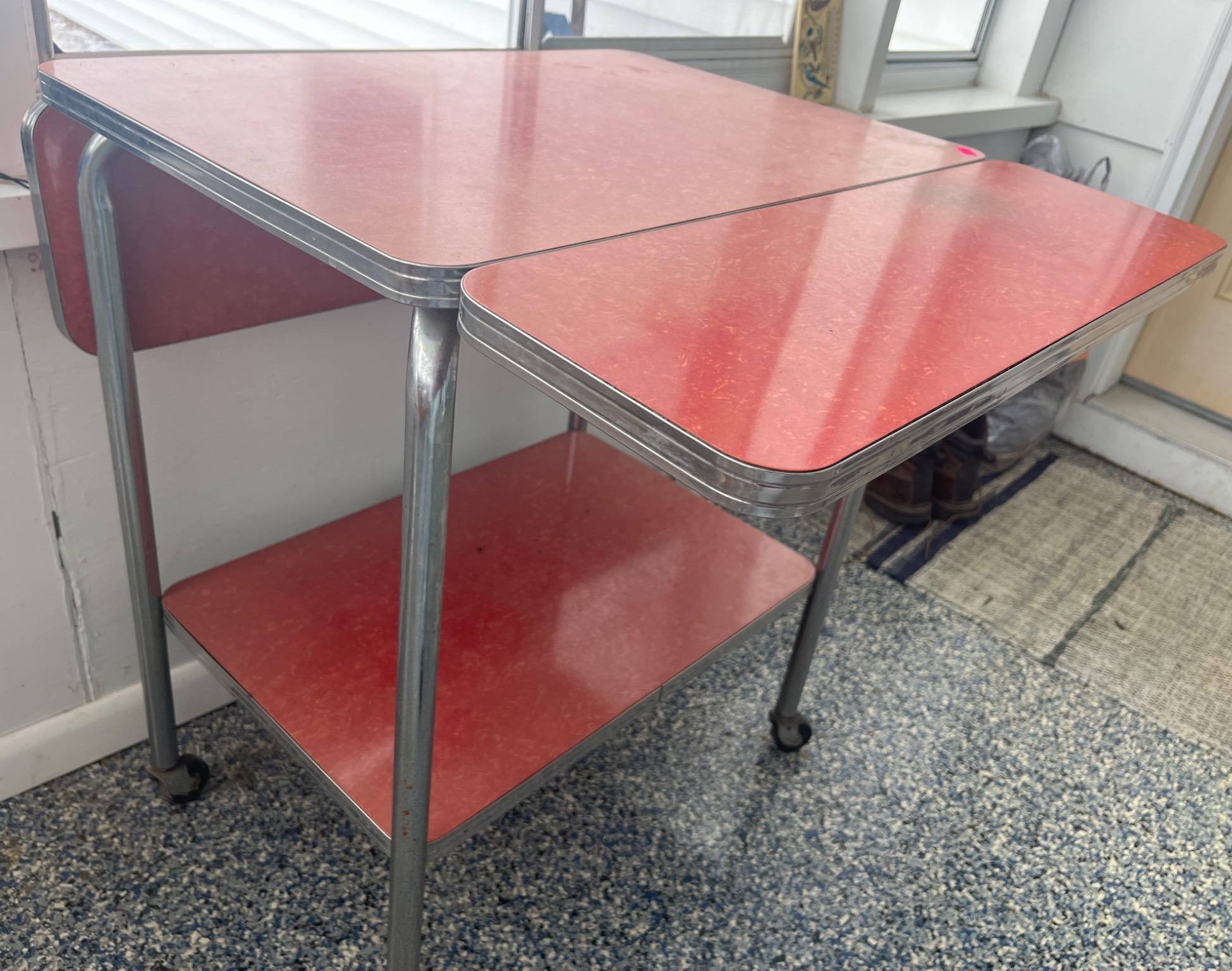 600 Red Laminate Drop-Leaf Rolling Table with Chrome Legs 24.5x19x29?