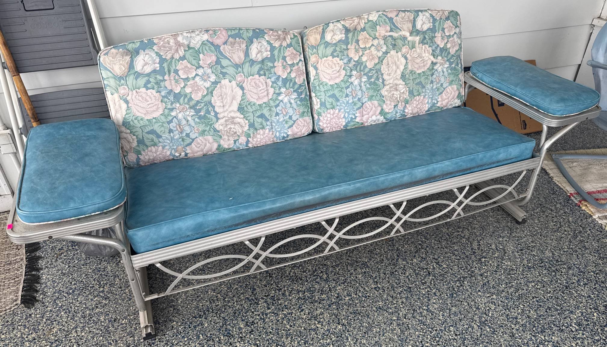 601 Retro Metal-Framed Sofa with Floral Cushions and Vinyl Upholstery, 87”x32”x30”