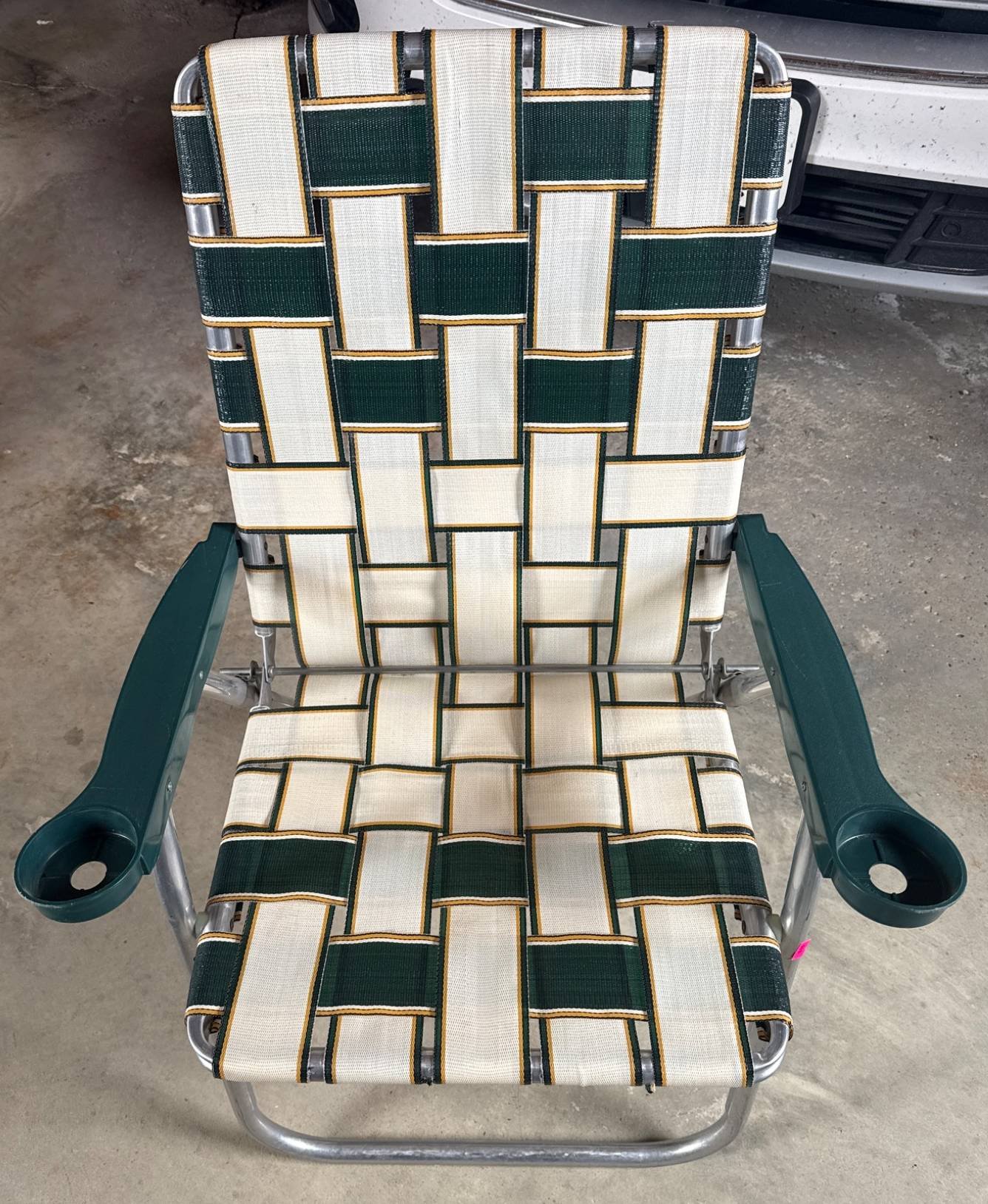 610 Folding Aluminum Chair with Green and White Woven Seat and Backrest 35x23x22.5?