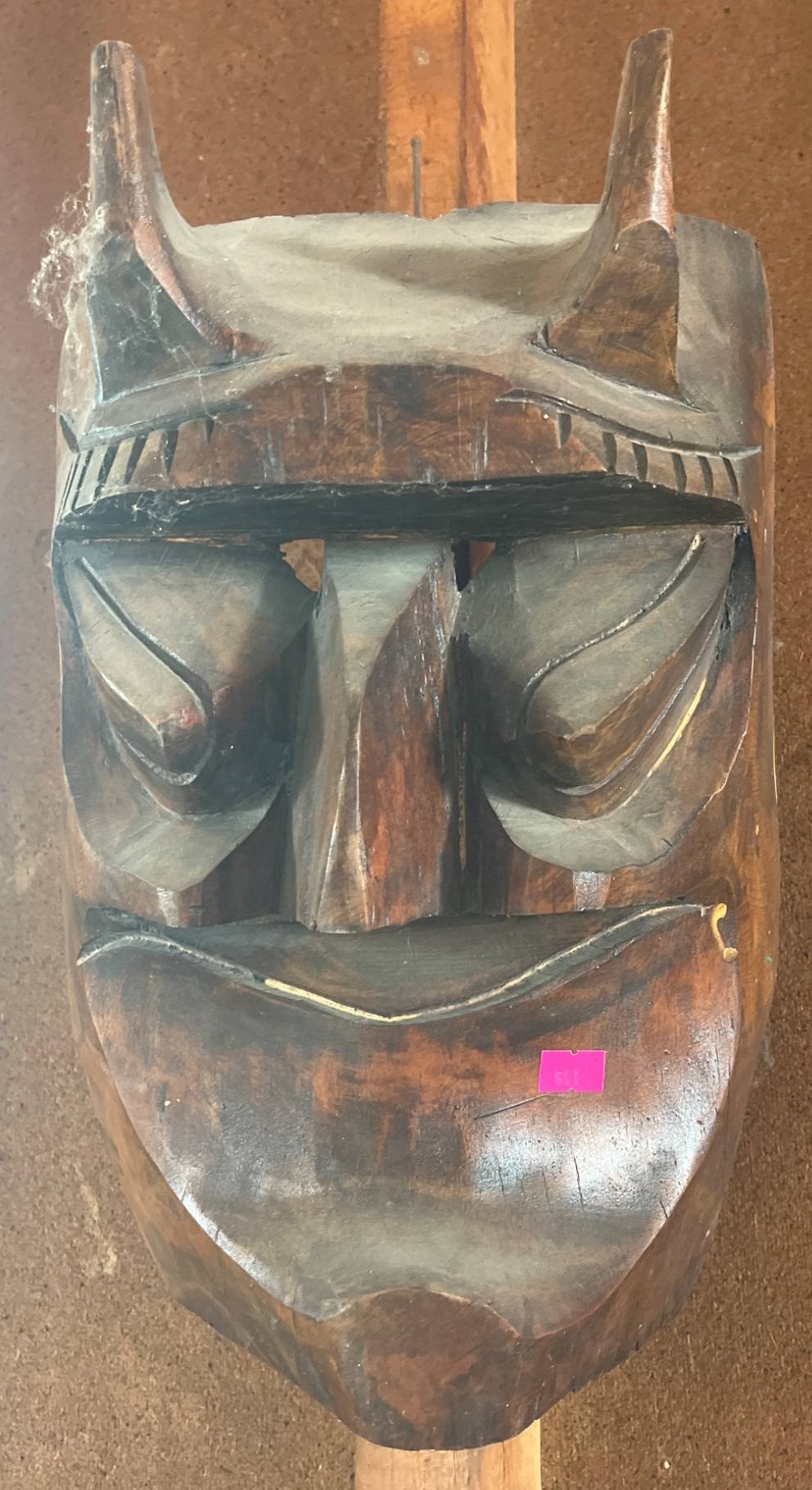 611 Hand-Carved Wood Mask with Horn-Like Details – Possibly Japanese Oni Style 15×11