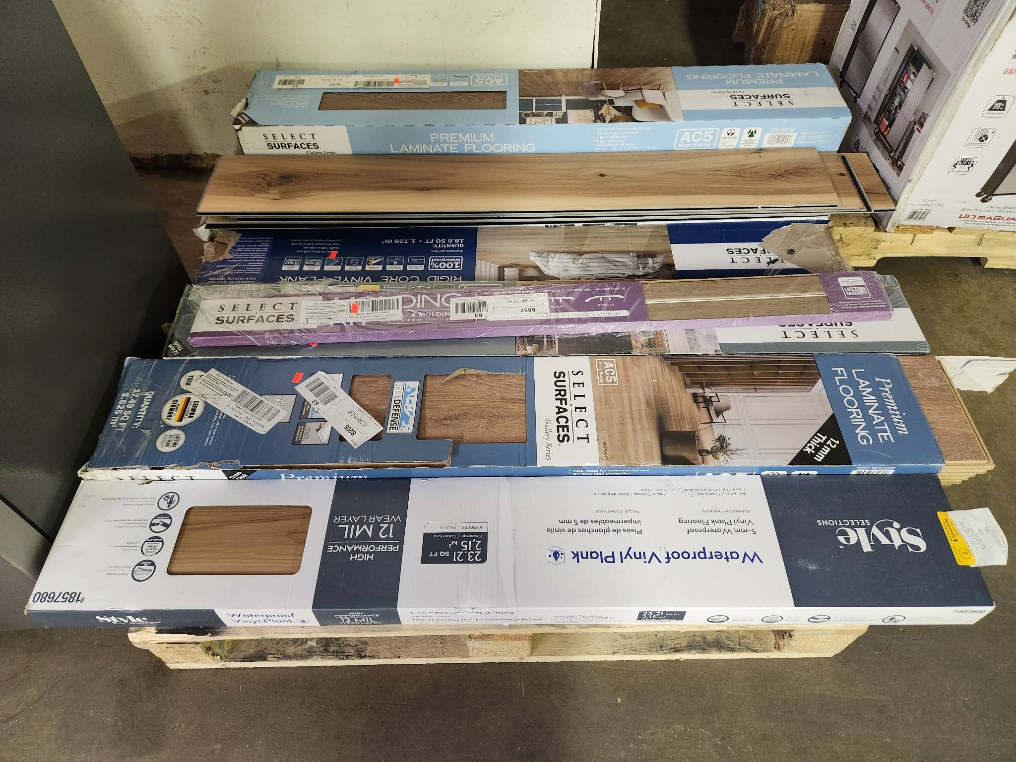 12 Assorted vinyl and laminate flooring 7 boxes and 1 molding