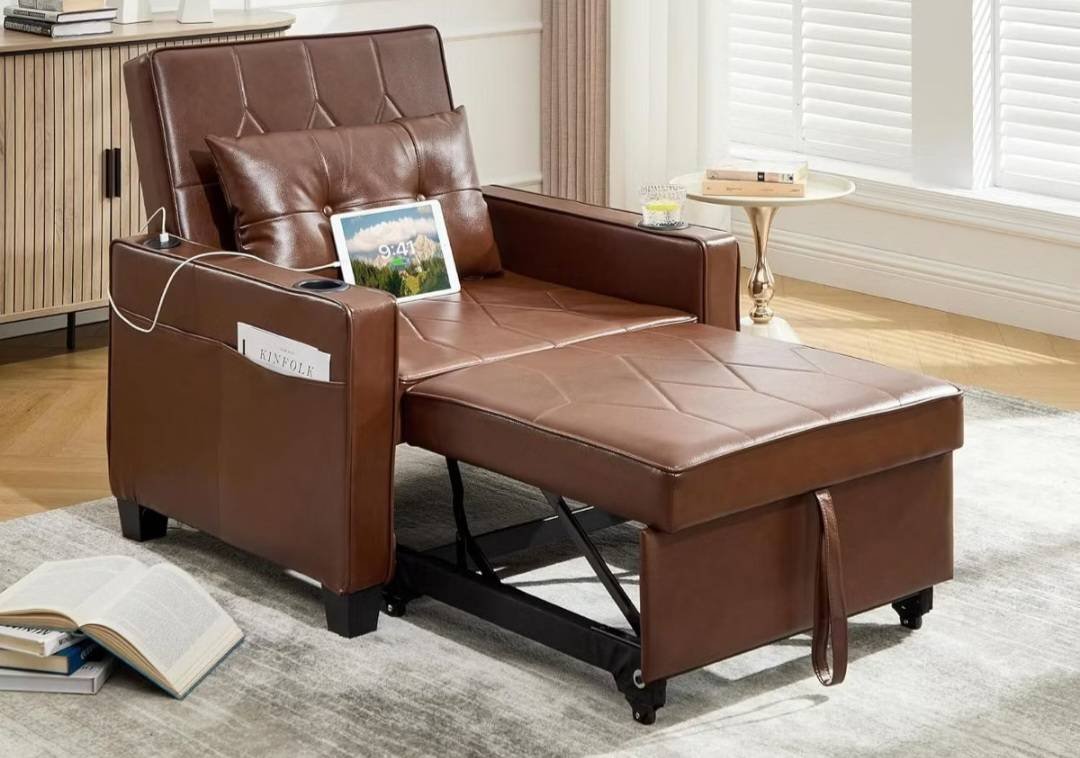 14 3-in-1 Convertible Sleeper Chair Bed with Cup Holders, Brown Faux Leather