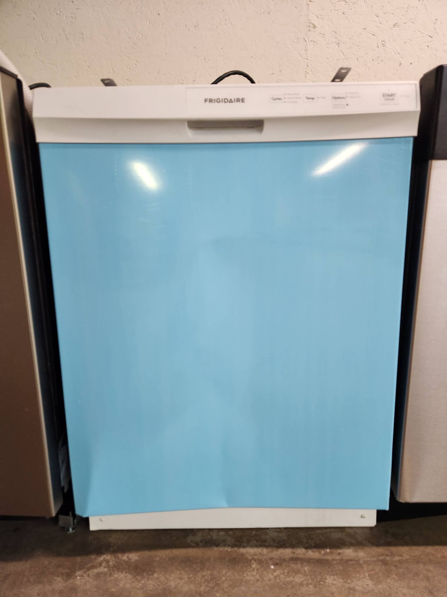 9 Frigidaire 24 in Front Control Built-In Tall Tub Dishwasher in White with 4-cycles and DishSense Sensor Technology model # FFCD2413UW6B is dented on front panel