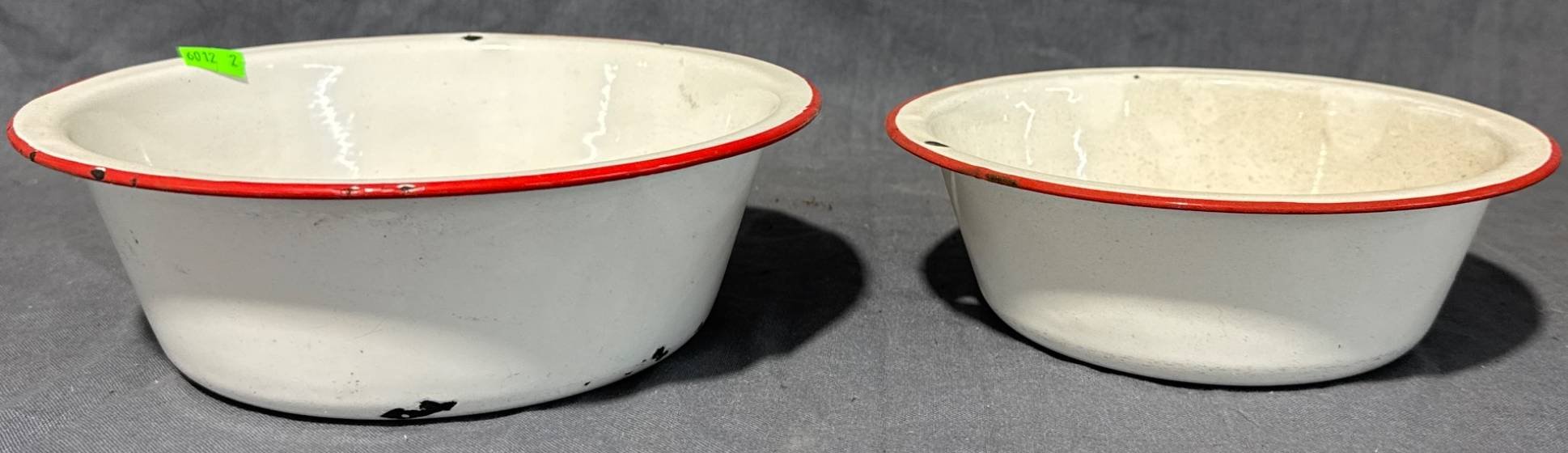 6012 2 White Enameled Bowls With Red Rims, 7.5” and 8.5”