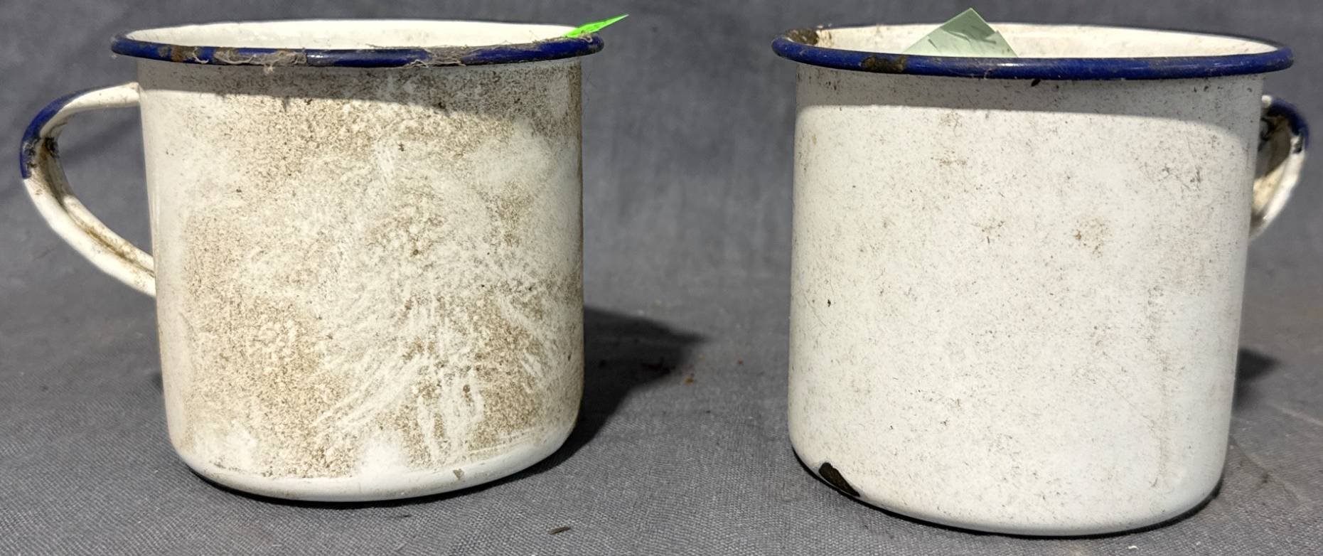 6013 (2) 3.25” White Enamel Cups with Blue Rims, Some Chips, Additional Details Below