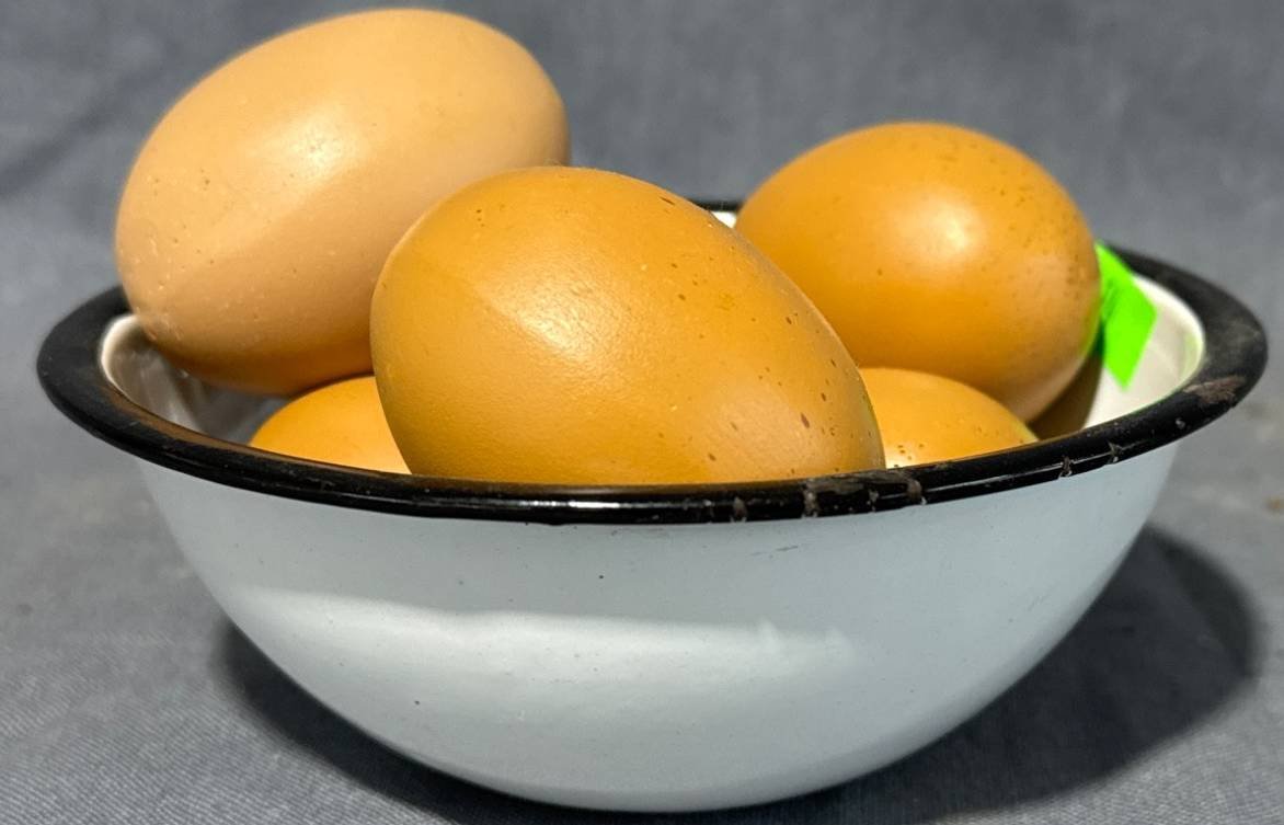 6014 Enamel Bowl with (6) Faux Brown Eggs, 2”x4”, 2?